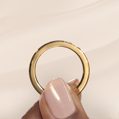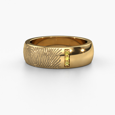 Was könnte einzigartiger sein als ein Fingerabdruck? Das macht diesen Damen Ehering mit Gelb Saphir so besonders. Ein persönlicher Fingerabdruck Ihres geliebten Menschen, in das Symbol Ihrer ewigen Liebe eingraviert. Wäre es nicht schön, diesen Fantasie Ehering an Ihrem Hochzeitstag auf den Finger Ihres Partners zu schieben? Wie funktioniert das? Zuerst bestellen Sie den Ehering, nachdem Sie ihn nach Ihren Wünschen angepasst haben. Sobald Ihre Bestellung aufgegeben wurde, senden Sie uns eine E-Mail mit dem von Ihnen gewünschten Fingerabdruck. Werfen Sie einen Blick in unsere Datenbank am unteren Rand dieser Seite, um weitere Anweisungen zum Erstellen eines Fingerabdrucks zu erhalten. Dieser Gold Daine Ehering hat eine Breite von ±6 mm. Gold steht für Liebe und deshalb liebt unser Goldschmied das Design Ihre Fantasie Ehering. Wir sind ein stolzes Mitglied des Responsible Jewellery Council. Das heißt, wir verwenden nur ehrliches Gold. Darauf sind wir natürlich sehr stolz. Es ist auch möglich, eigenes Gold für das Design Ihre Ehering zu verwenden. Jedes Schmuckstück wird von Hand in unserem eigenen Atelier angefertigt, so dass wir diese Option anbieten können. Das gibt Ihnen die Möglichkeit, Ihrem Ring eine zusätzliche persönliche Note hinzuzufügen. Jeder Ring hat seine eigene Geschichte.Sie können sich übrigens auch inspirieren lassen von diesem Eheringe und den Ringen weiter nach Ihrem Geschmack anpassen. Möchten Sie zum Beispiel lieber einen breiteren oder schmaleren Ring oder einen mattierten oder glänzenden Ring? Alles ist möglich. Auch wenn Sie selbst eine Idee haben für einzigartigen Eheringe, oder vielleicht haben Sie selbst irgendwo sonst einen schönen Set Eheringen gefunden: kein Problem! Sie können uns gern anrufen, unsere Designer besprechen gern alle Möglichkeiten mit Ihnen!Da wir unsere eigenen Ringe entwerfen und liefern, können wir Ihre Eheringe zu einem Preis anbieten, den Sie nirgendwo anders finden. Ein Ring wird auf Bestellung angefertigt, wodurch kein überschüssiges Material anfällt. So können wir Ihnen ein gutes Angebot zum besten Preis machen.Um es einfacher zu machen, bieten wir eine kostenlose 30-tägige Rücksendung.