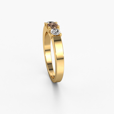 Dieser 3 Stone Ring wird Selina 1 genannt. Diese Art von Ring wird als Memoire ring bezeichnet, da seine Edelsteine in einer durchgehenden Linie angeordnet sind. Dadurch kann er einfach mit anderen Ringen kombiniert werden. Das Band dieses 14 Karat Gold Ring ist in einer Kombination aus Braun Diamant und Diamant besetzt. Sie können ganz einfach online die Kombination auswählen, die Sie bevorzugen. Wie Sie sehen, wird bei diesem Gold Memoire Ring mehre Braune Diamanten gesetzt. Der Memoire ring steht für Zusammenwirken. Und genau das tun diese Edelsteine, zusammenwirken. Zusammen geben sie dem Band eines moderne Ring einen schönen Effekt! So ein bedeutungsvoller Ring, finden Sie nicht auch? Alle von uns ausgesuchten Braune Diamanten werden von unserem erfahrenen Goldschiede in Handarbeit eingefasst. Das ist eine präzise Aufgabe, die nur durch die Kombination von purer Handwerkskunst und dem Einsatz neuester Techniken erfolgreich durchgeführt werden kann, um eine optimale Wirkung zu erzielen. Um eine perfekte Lichtreflexion zu erzeugen, müssen alle Edelsteine auf die gleiche Weise perfekt ausgerichtet sein. Während der Fertigung wird der Goldschmied Meister daher ständig die Lichtreflexion überwachen, um zu gewährleisten, dass die Braune Diamanten perfekt ausgerichtet sind. Das erfordert eine geschickte Hand und viel Geduld, aber dann wird das Endprodukt zu einem echten Kunstwerk. Und genau das ist unsere Mission!Mit unserer modernen Technik können wir Schmuckstücke von höchster Qualität mit größter Sorgfalt für Sie entwerfen und anpassen. Unsere Ringe sind immer um 30 Prozent günstiger als bei anderen Juwelieren. Wir fertigen Ringe auf Bestellung, also müssen wir keine großen Lager unterhalten. Wenn Sie ein bestimmtes Budget haben, beraten wir Sie gerne entsprechend.Unsere Online-Kollektion wird täglich um neue Schmuckdesigns ergänzt. Unser Team von leidenschaftlichen Designern ist bemüht, außergewöhnliche und vielfältige Designs zu kreieren. Haben Sie einen Ring gesehen, der Ihnen gefällt? Setzen Sie sich mit uns in Verbindung. Basierend auf einem guten Preis/Leistungsverhältnis machen wir Ihnen ein Angebot, das Sie nicht ablehnen können!Um es einfacher zu machen, bieten wir eine kostenlose 30-tägige Rücksendung.