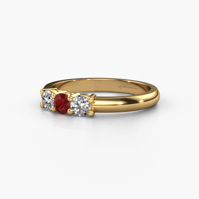 Dieser 3 Stone Ring wird Michelle 3 genannt. Diese Art von Ring wird als Memoire ring bezeichnet, da seine Edelsteine in einer durchgehenden Linie angeordnet sind. Dadurch kann er einfach mit anderen Ringen kombiniert werden. Das Band dieses 14 Karat Gold Ring ist in einer Kombination aus Rubin und Lab-grown Diamant besetzt. Sie können ganz einfach online die Kombination auswählen, die Sie bevorzugen. Wie Sie sehen, wird bei diesem Gold Memoire Ring mehre Rubin gesetzt. Der Memoire ring steht für Zusammenwirken. Und genau das tun diese Edelsteine, zusammenwirken. Zusammen geben sie dem Band eines klassische Ring einen schönen Effekt! So ein bedeutungsvoller Ring, finden Sie nicht auch? Alle von uns ausgesuchten Rubin werden von unserem erfahrenen Goldschiede in Handarbeit eingefasst. Das ist eine präzise Aufgabe, die nur durch die Kombination von purer Handwerkskunst und dem Einsatz neuester Techniken erfolgreich durchgeführt werden kann, um eine optimale Wirkung zu erzielen. Um eine perfekte Lichtreflexion zu erzeugen, müssen alle Edelsteine auf die gleiche Weise perfekt ausgerichtet sein. Während der Fertigung wird der Goldschmied Meister daher ständig die Lichtreflexion überwachen, um zu gewährleisten, dass die Rubin perfekt ausgerichtet sind. Das erfordert eine geschickte Hand und viel Geduld, aber dann wird das Endprodukt zu einem echten Kunstwerk. Und genau das ist unsere Mission!Haben Sie ein bestimmtes Budget? Sie können uns gerne kontaktieren, damit wir Ihre Optionen besprechen können. Wir bieten unsere Ringe zum garantiert besten Preis, denn wir fertigen sie auf Bestellung. Solche Preise finden Sie nirgendwo anders!