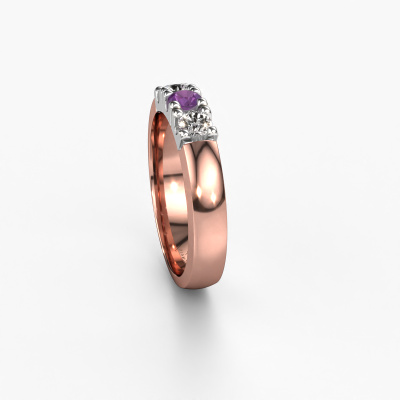 Dieser 3 Stone Ring wird Rianne 3 genannt. Diese Art von Ring wird als Memoire ring bezeichnet, da seine Edelsteine in einer durchgehenden Linie angeordnet sind. Dadurch kann er einfach mit anderen Ringen kombiniert werden. Das Band dieses 14 Karat Roségold Ring ist in einer Kombination aus Amethyst und Diamant besetzt. Sie können ganz einfach online die Kombination auswählen, die Sie bevorzugen. Wie Sie sehen, wird bei diesem Roségold Memoire Ring mehre Amethysten gesetzt. Der Memoire ring steht für Zusammenwirken. Und genau das tun diese Edelsteine, zusammenwirken. Zusammen geben sie dem Band eines klassische Ring einen schönen Effekt! So ein bedeutungsvoller Ring, finden Sie nicht auch? Alle von uns ausgesuchten Amethysten werden von unserem erfahrenen Goldschiede in Handarbeit eingefasst. Das ist eine präzise Aufgabe, die nur durch die Kombination von purer Handwerkskunst und dem Einsatz neuester Techniken erfolgreich durchgeführt werden kann, um eine optimale Wirkung zu erzielen. Um eine perfekte Lichtreflexion zu erzeugen, müssen alle Edelsteine auf die gleiche Weise perfekt ausgerichtet sein. Während der Fertigung wird der Goldschmied Meister daher ständig die Lichtreflexion überwachen, um zu gewährleisten, dass die Amethysten perfekt ausgerichtet sind. Das erfordert eine geschickte Hand und viel Geduld, aber dann wird das Endprodukt zu einem echten Kunstwerk. Und genau das ist unsere Mission!Nach Erhalt Ihrer Bestellung beginnen unsere Goldschmiede mit Leidenschaft den kreativen Prozess und fertigen Ihren Ring in unserem eigenen Studio. Da wir keine großen Lager haben, werden diese Kosten nicht an Sie weitergegeben. Unsere Preisgestaltung ist der Beweis dafür! Wir bieten Schmuck zum niedrigsten Preis, garantiert.Unser Team von talentierten, leidenschaftlichen Designern fügt unserer Online-Kollektion täglich neue Ringe-Designs hinzu. Unser Ziel dabei ist es, Ihnen eine große Vielfalt an Schmuckstücken anbieten zu können. Bitte zögern Sie nicht, ein Angebot anzufordern, wenn Sie spezielle Wünsche für Ihren Ring haben. Wir garantieren Ihnen ein Angebot, das Sie nicht ablehnen können.Um es einfacher zu machen, bieten wir eine kostenlose 30-tägige Rücksendung.