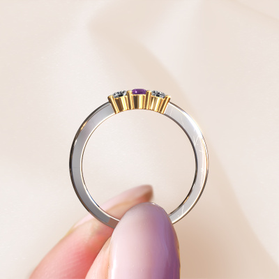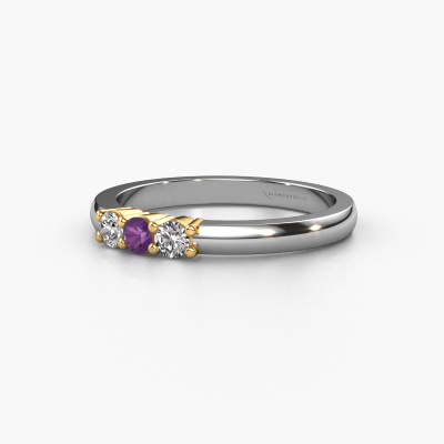 Dieser 3 Stone Ring wird Yasmin 3 genannt. Diese Art von Ring wird als Memoire ring bezeichnet, da seine Edelsteine in einer durchgehenden Linie angeordnet sind. Dadurch kann er einfach mit anderen Ringen kombiniert werden. Das Band dieses 14 Karat Weißgold Ring ist in einer Kombination aus Amethyst und Lab-grown Diamant besetzt. Sie können ganz einfach online die Kombination auswählen, die Sie bevorzugen. Wie Sie sehen, wird bei diesem Weißgold Memoire Ring mehre Amethysten gesetzt. Der Memoire ring steht für Zusammenwirken. Und genau das tun diese Edelsteine, zusammenwirken. Zusammen geben sie dem Band eines klassische Ring einen schönen Effekt! So ein bedeutungsvoller Ring, finden Sie nicht auch? Alle von uns ausgesuchten Amethysten werden von unserem erfahrenen Goldschiede in Handarbeit eingefasst. Das ist eine präzise Aufgabe, die nur durch die Kombination von purer Handwerkskunst und dem Einsatz neuester Techniken erfolgreich durchgeführt werden kann, um eine optimale Wirkung zu erzielen. Um eine perfekte Lichtreflexion zu erzeugen, müssen alle Edelsteine auf die gleiche Weise perfekt ausgerichtet sein. Während der Fertigung wird der Goldschmied Meister daher ständig die Lichtreflexion überwachen, um zu gewährleisten, dass die Amethysten perfekt ausgerichtet sind. Das erfordert eine geschickte Hand und viel Geduld, aber dann wird das Endprodukt zu einem echten Kunstwerk. Und genau das ist unsere Mission!Durch die Kombination modernster Technik mit uralter Handwerkskunst können wir alle Ringe in unserem eigenen Studio anfertigen. Jedes Schmuckstück wird auf Anfrage gefertigt. Das ist vorteilhaft, weil wir Ihnen dadurch einen Preis anbieten können, den Sie nirgendwo anders finden.Unsere talentierten, leidenschaftlichen Designer fügen unserer Online-Kollektion täglich neue Designs hinzu. Zusammen versuchen sie, eine vielfältige Kollektion feinster Schmuckstücke zu erstellen. Wenn Sie es vorziehen, einen Ring nach Ihrem eigenen Entwurf zu machen, können Sie gerne ein Angebot anfordern. Wir machen Ihnen ein großartiges Angebot, basierend auf Qualität und Preis.Um es einfacher zu machen, bieten wir eine kostenlose 30-tägige Rücksendung.