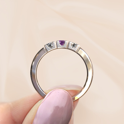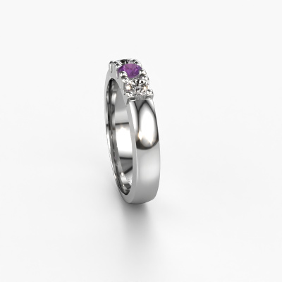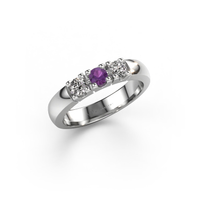 Dieser 3 Stone Ring wird Rianne 3 genannt. Diese Art von Ring wird als Memoire ring bezeichnet, da seine Edelsteine in einer durchgehenden Linie angeordnet sind. Dadurch kann er einfach mit anderen Ringen kombiniert werden. Das Band dieses 14 Karat Weißgold Ring ist in einer Kombination aus Amethyst und Diamant besetzt. Sie können ganz einfach online die Kombination auswählen, die Sie bevorzugen. Wie Sie sehen, wird bei diesem Weißgold Memoire Ring mehre Amethysten gesetzt. Der Memoire ring steht für Zusammenwirken. Und genau das tun diese Edelsteine, zusammenwirken. Zusammen geben sie dem Band eines klassische Ring einen schönen Effekt! So ein bedeutungsvoller Ring, finden Sie nicht auch? Alle von uns ausgesuchten Amethysten werden von unserem erfahrenen Goldschiede in Handarbeit eingefasst. Das ist eine präzise Aufgabe, die nur durch die Kombination von purer Handwerkskunst und dem Einsatz neuester Techniken erfolgreich durchgeführt werden kann, um eine optimale Wirkung zu erzielen. Um eine perfekte Lichtreflexion zu erzeugen, müssen alle Edelsteine auf die gleiche Weise perfekt ausgerichtet sein. Während der Fertigung wird der Goldschmied Meister daher ständig die Lichtreflexion überwachen, um zu gewährleisten, dass die Amethysten perfekt ausgerichtet sind. Das erfordert eine geschickte Hand und viel Geduld, aber dann wird das Endprodukt zu einem echten Kunstwerk. Und genau das ist unsere Mission!Nach Erhalt Ihrer Bestellung beginnen unsere Goldschmiede mit Leidenschaft den kreativen Prozess und fertigen Ihren Ring in unserem eigenen Studio. Da wir keine großen Lager haben, werden diese Kosten nicht an Sie weitergegeben. Unsere Preisgestaltung ist der Beweis dafür! Wir bieten Schmuck zum niedrigsten Preis, garantiert.Unser Team von talentierten, leidenschaftlichen Designern fügt unserer Online-Kollektion täglich neue Ringe-Designs hinzu. Unser Ziel dabei ist es, Ihnen eine große Vielfalt an Schmuckstücken anbieten zu können. Bitte zögern Sie nicht, ein Angebot anzufordern, wenn Sie spezielle Wünsche für Ihren Ring haben. Wir garantieren Ihnen ein Angebot, das Sie nicht ablehnen können.Um es einfacher zu machen, bieten wir eine kostenlose 30-tägige Rücksendung.