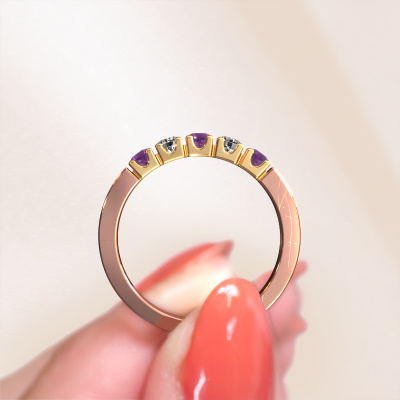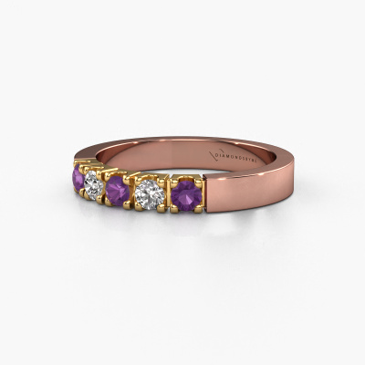 Dieser 5 Stone Ring wird Dana 5 genannt. Diese Art von Ring wird als Memoire ring bezeichnet, da seine Edelsteine in einer durchgehenden Linie angeordnet sind. Dadurch kann er einfach mit anderen Ringen kombiniert werden. Das Band dieses 14 Karat Roségold Ring ist in einer Kombination aus Amethyst und Diamant besetzt. Sie können ganz einfach online die Kombination auswählen, die Sie bevorzugen. Wie Sie sehen, wird bei diesem Roségold Memoire Ring mehre Amethysten gesetzt. Der Memoire ring steht für Zusammenwirken. Und genau das tun diese Edelsteine, zusammenwirken. Zusammen geben sie dem Band eines moderne Ring einen schönen Effekt! So ein bedeutungsvoller Ring, finden Sie nicht auch? Alle von uns ausgesuchten Amethysten werden von unserem erfahrenen Goldschiede in Handarbeit eingefasst. Das ist eine präzise Aufgabe, die nur durch die Kombination von purer Handwerkskunst und dem Einsatz neuester Techniken erfolgreich durchgeführt werden kann, um eine optimale Wirkung zu erzielen. Um eine perfekte Lichtreflexion zu erzeugen, müssen alle Edelsteine auf die gleiche Weise perfekt ausgerichtet sein. Während der Fertigung wird der Goldschmied Meister daher ständig die Lichtreflexion überwachen, um zu gewährleisten, dass die Amethysten perfekt ausgerichtet sind. Das erfordert eine geschickte Hand und viel Geduld, aber dann wird das Endprodukt zu einem echten Kunstwerk. Und genau das ist unsere Mission!Da wir unsere eigenen Ringe entwerfen und liefern, können wir Ihnen einen Ring zu einem Preis anbieten, den Sie nirgendwo anders finden. Ein Ring wird auf Bestellung angefertigt, wodurch kein überschüssiges Material anfällt. So können wir Ihnen ein gutes Angebot zum besten Preis machen. Wir verstehen, dass es sich riskant anfühlt, Ihren Ring online zu kaufen. Jedoch helfen wir Ihnen gerne beim Designprozess unter Berücksichtigung Ihres Budgets.Unsere Online-Kollektion wird täglich um neue Schmuckdesigns ergänzt. Unser Team von leidenschaftlichen Designern ist bemüht, außergewöhnliche und vielfältige Designs zu kreieren. Haben Sie einen Ring gesehen, der Ihnen gefällt? Setzen Sie sich mit uns in Verbindung. Basierend auf einem guten Preis/Leistungsverhältnis machen wir Ihnen ein Angebot, das Sie nicht ablehnen können!Um es einfacher zu machen, bieten wir eine kostenlose 30-tägige Rücksendung.