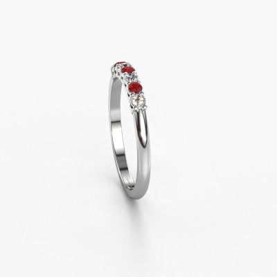 Dieser 7 Stone Ring wird Michelle 7 genannt. Diese Art von Ring wird als Memoire ring bezeichnet, da seine Edelsteine in einer durchgehenden Linie angeordnet sind. Dadurch kann er einfach mit anderen Ringen kombiniert werden. Das Band dieses Platin Ring ist in einer Kombination aus Rubin und Diamant besetzt. Sie können ganz einfach online die Kombination auswählen, die Sie bevorzugen. Wie Sie sehen, wird bei diesem Platin Memoire Ring mehre Rubin gesetzt. Der Memoire ring steht für Zusammenwirken. Und genau das tun diese Edelsteine, zusammenwirken. Zusammen geben sie dem Band eines klassische Ring einen schönen Effekt! So ein bedeutungsvoller Ring, finden Sie nicht auch? Alle von uns ausgesuchten Rubin werden von unserem erfahrenen Goldschiede in Handarbeit eingefasst. Das ist eine präzise Aufgabe, die nur durch die Kombination von purer Handwerkskunst und dem Einsatz neuester Techniken erfolgreich durchgeführt werden kann, um eine optimale Wirkung zu erzielen. Um eine perfekte Lichtreflexion zu erzeugen, müssen alle Edelsteine auf die gleiche Weise perfekt ausgerichtet sein. Während der Fertigung wird der Goldschmied Meister daher ständig die Lichtreflexion überwachen, um zu gewährleisten, dass die Rubin perfekt ausgerichtet sind. Das erfordert eine geschickte Hand und viel Geduld, aber dann wird das Endprodukt zu einem echten Kunstwerk. Und genau das ist unsere Mission!Nach Erhalt Ihrer Bestellung beginnen unsere Goldschmiede mit Leidenschaft den kreativen Prozess und fertigen Ihren Ring in unserem eigenen Studio. Da wir keine großen Lager haben, werden diese Kosten nicht an Sie weitergegeben. Unsere Preisgestaltung ist der Beweis dafür! Wir bieten Schmuck zum niedrigsten Preis, garantiert.