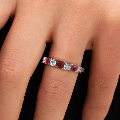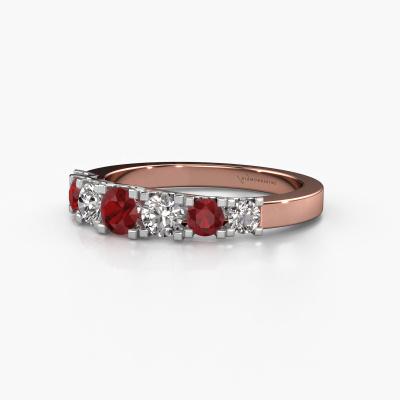 Dieser 7 Stone Ring wird Selina 3 genannt. Diese Art von Ring wird als Memoire ring bezeichnet, da seine Edelsteine in einer durchgehenden Linie angeordnet sind. Dadurch kann er einfach mit anderen Ringen kombiniert werden. Das Band dieses 14 Karat Roségold Ring ist in einer Kombination aus Rubin und Diamant besetzt. Sie können ganz einfach online die Kombination auswählen, die Sie bevorzugen. Wie Sie sehen, wird bei diesem Roségold Memoire Ring mehre Rubin gesetzt. Der Memoire ring steht für Zusammenwirken. Und genau das tun diese Edelsteine, zusammenwirken. Zusammen geben sie dem Band eines moderne Ring einen schönen Effekt! So ein bedeutungsvoller Ring, finden Sie nicht auch? Alle von uns ausgesuchten Rubin werden von unserem erfahrenen Goldschiede in Handarbeit eingefasst. Das ist eine präzise Aufgabe, die nur durch die Kombination von purer Handwerkskunst und dem Einsatz neuester Techniken erfolgreich durchgeführt werden kann, um eine optimale Wirkung zu erzielen. Um eine perfekte Lichtreflexion zu erzeugen, müssen alle Edelsteine auf die gleiche Weise perfekt ausgerichtet sein. Während der Fertigung wird der Goldschmied Meister daher ständig die Lichtreflexion überwachen, um zu gewährleisten, dass die Rubin perfekt ausgerichtet sind. Das erfordert eine geschickte Hand und viel Geduld, aber dann wird das Endprodukt zu einem echten Kunstwerk. Und genau das ist unsere Mission!Da wir unsere eigenen Ringe entwerfen und liefern, können wir Ihnen einen Ring zu einem Preis anbieten, den Sie nirgendwo anders finden. Ein Ring wird auf Bestellung angefertigt, wodurch kein überschüssiges Material anfällt. So können wir Ihnen ein gutes Angebot zum besten Preis machen. Wir verstehen, dass es sich riskant anfühlt, Ihren Ring online zu kaufen. Jedoch helfen wir Ihnen gerne beim Designprozess unter Berücksichtigung Ihres Budgets.Unser Team von talentierten, leidenschaftlichen Designern fügt unserer Online-Kollektion täglich neue Ringe-Designs hinzu. Unser Ziel dabei ist es, Ihnen eine große Vielfalt an Schmuckstücken anbieten zu können. Bitte zögern Sie nicht, ein Angebot anzufordern, wenn Sie spezielle Wünsche für Ihren Ring haben. Wir garantieren Ihnen ein Angebot, das Sie nicht ablehnen können.Um es einfacher zu machen, bieten wir eine kostenlose 30-tägige Rücksendung.