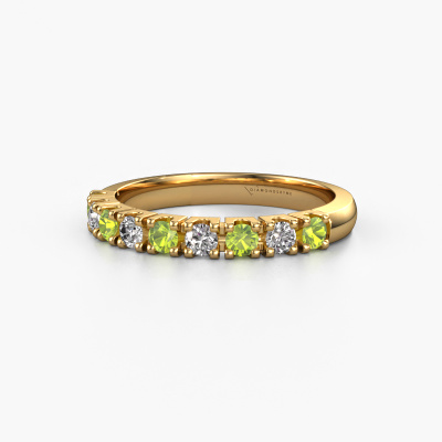 Dieser 9 Stone Ring wird Rianne 9 genannt. Diese Art von Ring wird als Memoire ring bezeichnet, da seine Edelsteine in einer durchgehenden Linie angeordnet sind. Dadurch kann er einfach mit anderen Ringen kombiniert werden. Das Band dieses 14 Karat Gold Ring ist in einer Kombination aus Peridot und Diamant besetzt. Sie können ganz einfach online die Kombination auswählen, die Sie bevorzugen. Wie Sie sehen, wird bei diesem Gold Memoire Ring mehre Peridot gesetzt. Der Memoire ring steht für Zusammenwirken. Und genau das tun diese Edelsteine, zusammenwirken. Zusammen geben sie dem Band eines klassische Ring einen schönen Effekt! So ein bedeutungsvoller Ring, finden Sie nicht auch? Alle von uns ausgesuchten Peridot werden von unserem erfahrenen Goldschiede in Handarbeit eingefasst. Das ist eine präzise Aufgabe, die nur durch die Kombination von purer Handwerkskunst und dem Einsatz neuester Techniken erfolgreich durchgeführt werden kann, um eine optimale Wirkung zu erzielen. Um eine perfekte Lichtreflexion zu erzeugen, müssen alle Edelsteine auf die gleiche Weise perfekt ausgerichtet sein. Während der Fertigung wird der Goldschmied Meister daher ständig die Lichtreflexion überwachen, um zu gewährleisten, dass die Peridot perfekt ausgerichtet sind. Das erfordert eine geschickte Hand und viel Geduld, aber dann wird das Endprodukt zu einem echten Kunstwerk. Und genau das ist unsere Mission!Haben Sie ein bestimmtes Budget? Sie können uns gerne kontaktieren, damit wir Ihre Optionen besprechen können. Wir bieten unsere Ringe zum garantiert besten Preis, denn wir fertigen sie auf Bestellung. Solche Preise finden Sie nirgendwo anders!