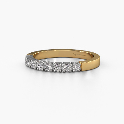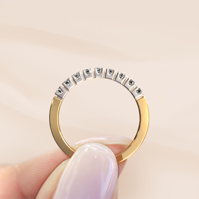 Dieser 9 Stone Ring wird Dana 9 genannt. Diese Art von Ring wird als Memoire ring bezeichnet, da seine Edelsteine in einer durchgehenden Linie angeordnet sind. Dadurch kann er einfach mit anderen Ringen kombiniert werden. Das Band dieses 14 Karat Gold Ring ist in einer Kombination aus Diamant und Diamant besetzt. Sie können ganz einfach online die Kombination auswählen, die Sie bevorzugen. Wie Sie sehen, wird bei diesem Gold Memoire Ring mehre Diamanten gesetzt. Der Memoire ring steht für Zusammenwirken. Und genau das tun diese Edelsteine, zusammenwirken. Zusammen geben sie dem Band eines moderne Ring einen schönen Effekt! So ein bedeutungsvoller Ring, finden Sie nicht auch? Alle von uns ausgesuchten Diamanten werden von unserem erfahrenen Goldschiede in Handarbeit eingefasst. Das ist eine präzise Aufgabe, die nur durch die Kombination von purer Handwerkskunst und dem Einsatz neuester Techniken erfolgreich durchgeführt werden kann, um eine optimale Wirkung zu erzielen. Um eine perfekte Lichtreflexion zu erzeugen, müssen alle Edelsteine auf die gleiche Weise perfekt ausgerichtet sein. Während der Fertigung wird der Goldschmied Meister daher ständig die Lichtreflexion überwachen, um zu gewährleisten, dass die Diamanten perfekt ausgerichtet sind. Das erfordert eine geschickte Hand und viel Geduld, aber dann wird das Endprodukt zu einem echten Kunstwerk. Und genau das ist unsere Mission!Nach Erhalt Ihrer Bestellung beginnen unsere Goldschmiede mit Leidenschaft den kreativen Prozess und fertigen Ihren Ring in unserem eigenen Studio. Da wir keine großen Lager haben, werden diese Kosten nicht an Sie weitergegeben. Unsere Preisgestaltung ist der Beweis dafür! Wir bieten Schmuck zum niedrigsten Preis, garantiert.Unsere talentierten, leidenschaftlichen Designer fügen unserer Online-Kollektion täglich neue Designs hinzu. Zusammen versuchen sie, eine vielfältige Kollektion feinster Schmuckstücke zu erstellen. Wenn Sie es vorziehen, einen Ring nach Ihrem eigenen Entwurf zu machen, können Sie gerne ein Angebot anfordern. Wir machen Ihnen ein großartiges Angebot, basierend auf Qualität und Preis.Um es einfacher zu machen, bieten wir eine kostenlose 30-tägige Rücksendung.