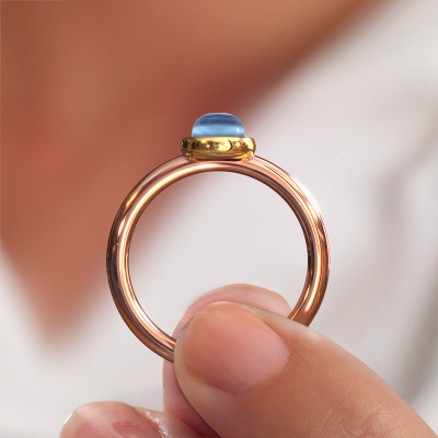 In diesem Foto ist der Roségold Blossom OVL 2 Ring mit einem 7x5 mm oval cabochon Blau Topas besetzt. Cabochon bedeutet, dass ein Blau Topas zuerst geformt, nicht facettiert wird. Nämlich in eine bestimmte Form wie einen Tropfen, ein Herz oder ein oval cabochon. Anschließend wird er poliert, bis der Edelstein eine Runde Oberfläche hat. Ein Cabochon-Edelstein ist ein atemberaubender, nobler Blickfang, der perfekt zu einem zeitgenössischen wie auch zu einem Vintage-Stil passt. Unsere erfahrenen Goldschmiede formen den modische Ring bis zur Perfektion und machen ihn einzigartig. Der Cabochon Blau Topas ist so gefasst, dass seine einzigartigen Qualitäten verstärkt werden. Der modische Blossom OVL 2 Ring, wie hier abgebildet, kann ganz nach Ihren Wünschen gestaltet werden. Unser Online-Tool bietet viele verschiedene Möglichkeiten. Bitte kontaktieren Sie uns, wenn Sie Änderungen an Ihrem Blossom OVL 2 Ring wünschen, die in unserem Online-Tool nicht verfügbar sind.Nach Erhalt Ihrer Bestellung beginnen unsere Goldschmiede mit Leidenschaft den kreativen Prozess und fertigen Ihren Ring in unserem eigenen Studio. Da wir keine großen Lager haben, werden diese Kosten nicht an Sie weitergegeben. Unsere Preisgestaltung ist der Beweis dafür! Wir bieten Schmuck zum niedrigsten Preis, garantiert.Um es einfacher zu machen, bieten wir eine kostenlose 30-tägige Rücksendung.