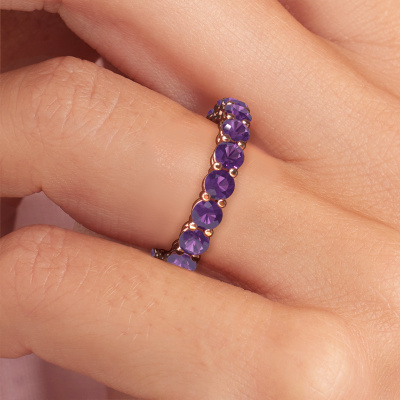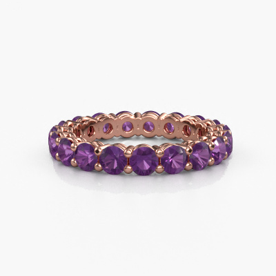 Das ist unser Michelle full 3.4-Ring. Dieser spezielle Typ wird als Eternity ring bezeichnet und ist mit einer durchgehenden Linie von identisch geschliffenen Edelsteinen besetzt. Er ist aus 14 Karat Roségold und mit kleineren Amethyst 3.4 mm besetzt. Dieser Roségold Eternity Ring ist eine wunderschöne und sinnvolle Möglichkeit, Ihrem Antrag eine besondere Note zu verleihen. Die herrlich gleichmäßig geformten Amethysten sind rund um den Ring eingefasst. Die identischen Amethysten werden sorgfältig ausgewählt, um dem Ring eine maximale Wirkung zu verleihen. Denken Sie daran, dass wir natürliche Ressourcen verwenden. Daher sind kleine Unterschiede zwischen den Steinen üblich. Der besondere Effekt wird durch die präzise Positionierung der Amethysten noch verstärkt. Dies erfordert äußerste Präzision und eine geschickte Hand. Für unsere erfahrenen Juweliere ist die pure Leidenschaft. Am Ende bekommen Sie einen Vorsteckring mit einer Reihe von Amethysten, die weder Anfang noch Ende zu haben scheinen. Das perfekte Symbol für Ihre Liebe zu ihr! Ist sie nicht eine Schönheit? Durch die Kombination modernster Technik mit uralter Handwerkskunst können wir alle Ringe in unserem eigenen Studio anfertigen. Jedes Schmuckstück wird auf Anfrage gefertigt. Das ist vorteilhaft, weil wir Ihnen dadurch einen Preis anbieten können, den Sie nirgendwo anders finden.Unsere Online-Kollektion wird täglich um neue Schmuckdesigns ergänzt. Unser Team von leidenschaftlichen Designern ist bemüht, außergewöhnliche und vielfältige Designs zu kreieren. Haben Sie einen Ring gesehen, der Ihnen gefällt? Setzen Sie sich mit uns in Verbindung. Basierend auf einem guten Preis/Leistungsverhältnis machen wir Ihnen ein Angebot, das Sie nicht ablehnen können!Um es einfacher zu machen, bieten wir eine kostenlose 30-tägige Rücksendung.