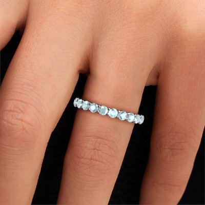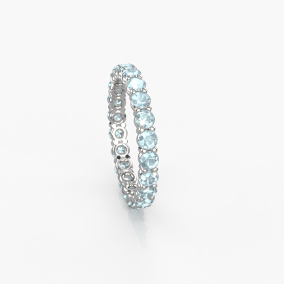 Das ist unser Heddy rnd 2.7-Ring. Dieser spezielle Typ wird als Eternity ring bezeichnet und ist mit einer durchgehenden Linie von identisch geschliffenen Edelsteinen besetzt. Er ist aus 14 Karat Weißgold und mit kleineren Aquamarin 2.7 mm besetzt. Dieser Weißgold Eternity Ring ist eine wunderschöne und sinnvolle Möglichkeit, Ihrem Antrag eine besondere Note zu verleihen. Die herrlich gleichmäßig geformten Aquamarins sind rund um den Ring eingefasst. Die identischen Aquamarins werden sorgfältig ausgewählt, um dem Ring eine maximale Wirkung zu verleihen. Denken Sie daran, dass wir natürliche Ressourcen verwenden. Daher sind kleine Unterschiede zwischen den Steinen üblich. Der besondere Effekt wird durch die präzise Positionierung der Aquamarins noch verstärkt. Dies erfordert äußerste Präzision und eine geschickte Hand. Für unsere erfahrenen Juweliere ist die pure Leidenschaft. Am Ende bekommen Sie einen Vorsteckring mit einer Reihe von Aquamarins, die weder Anfang noch Ende zu haben scheinen. Das perfekte Symbol für Ihre Liebe zu ihr! Ist sie nicht eine Schönheit? Da wir unsere eigenen Ringe entwerfen und liefern, können wir Ihnen einen Ring zu einem Preis anbieten, den Sie nirgendwo anders finden. Ein Ring wird auf Bestellung angefertigt, wodurch kein überschüssiges Material anfällt. So können wir Ihnen ein gutes Angebot zum besten Preis machen. Wir verstehen, dass es sich riskant anfühlt, Ihren Ring online zu kaufen. Jedoch helfen wir Ihnen gerne beim Designprozess unter Berücksichtigung Ihres Budgets.Unser Team von talentierten, leidenschaftlichen Designern fügt unserer Online-Kollektion täglich neue Ringe-Designs hinzu. Unser Ziel dabei ist es, Ihnen eine große Vielfalt an Schmuckstücken anbieten zu können. Bitte zögern Sie nicht, ein Angebot anzufordern, wenn Sie spezielle Wünsche für Ihren Ring haben. Wir garantieren Ihnen ein Angebot, das Sie nicht ablehnen können.Um es einfacher zu machen, bieten wir eine kostenlose 30-tägige Rücksendung.
