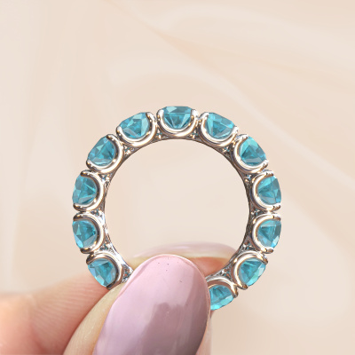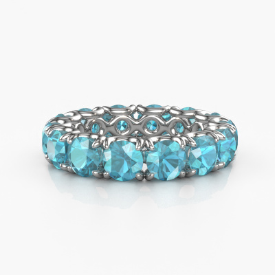 Das ist unser Estee 4.7-Ring. Dieser spezielle Typ wird als Eternity ring bezeichnet und ist mit einer durchgehenden Linie von identisch geschliffenen Edelsteinen besetzt. Er ist aus 14 Karat Weißgold und mit kleineren Blau Topas 4.7 mm besetzt. Dieser Weißgold Eternity Ring ist eine wunderschöne und sinnvolle Möglichkeit, Ihrem Antrag eine besondere Note zu verleihen. Die herrlich gleichmäßig geformten Blaue Topas sind rund um den Ring eingefasst. Die identischen Blaue Topas werden sorgfältig ausgewählt, um dem Ring eine maximale Wirkung zu verleihen. Denken Sie daran, dass wir natürliche Ressourcen verwenden. Daher sind kleine Unterschiede zwischen den Steinen üblich. Der besondere Effekt wird durch die präzise Positionierung der Blaue Topas noch verstärkt. Dies erfordert äußerste Präzision und eine geschickte Hand. Für unsere erfahrenen Juweliere ist die pure Leidenschaft. Am Ende bekommen Sie einen Ring mit einer Reihe von Blaue Topas, die weder Anfang noch Ende zu haben scheinen. Das perfekte Symbol für Ihre Liebe zu ihr! Ist sie nicht eine Schönheit? Mit unserer modernen Technik können wir Schmuckstücke von höchster Qualität mit größter Sorgfalt für Sie entwerfen und anpassen. Unsere Ringe sind immer um 30 Prozent günstiger als bei anderen Juwelieren. Wir fertigen Ringe auf Bestellung, also müssen wir keine großen Lager unterhalten. Wenn Sie ein bestimmtes Budget haben, beraten wir Sie gerne entsprechend.