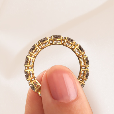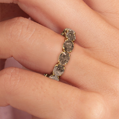 Das ist unser Vivienne OVL 5x4-Ring. Dieser spezielle Typ wird als Eternity ring bezeichnet und ist mit einer durchgehenden Linie von identisch geschliffenen Edelsteinen besetzt. Er ist aus 14 Karat Gold und mit kleineren Braun Diamant 0.35 crt besetzt. Dieser Gold Eternity Ring ist eine wunderschöne und sinnvolle Möglichkeit, Ihrem Antrag eine besondere Note zu verleihen. Die herrlich gleichmäßig geformten Braune Diamanten sind rund um den Ring eingefasst. Die identischen Braune Diamanten werden sorgfältig ausgewählt, um dem Ring eine maximale Wirkung zu verleihen. Denken Sie daran, dass wir natürliche Ressourcen verwenden. Daher sind kleine Unterschiede zwischen den Steinen üblich. Der besondere Effekt wird durch die präzise Positionierung der Braune Diamanten noch verstärkt. Dies erfordert äußerste Präzision und eine geschickte Hand. Für unsere erfahrenen Juweliere ist die pure Leidenschaft. Am Ende bekommen Sie einen Ring mit einer Reihe von Braune Diamanten, die weder Anfang noch Ende zu haben scheinen. Das perfekte Symbol für Ihre Liebe zu ihr! Ist sie nicht eine Schönheit? Mit unserer modernen Technik können wir Schmuckstücke von höchster Qualität mit größter Sorgfalt für Sie entwerfen und anpassen. Unsere Ringe sind immer um 30 Prozent günstiger als bei anderen Juwelieren. Wir fertigen Ringe auf Bestellung, also müssen wir keine großen Lager unterhalten. Wenn Sie ein bestimmtes Budget haben, beraten wir Sie gerne entsprechend.Unsere Online-Kollektion wird täglich um neue Schmuckdesigns ergänzt. Unser Team von leidenschaftlichen Designern ist bemüht, außergewöhnliche und vielfältige Designs zu kreieren. Haben Sie einen Ring gesehen, der Ihnen gefällt? Setzen Sie sich mit uns in Verbindung. Basierend auf einem guten Preis/Leistungsverhältnis machen wir Ihnen ein Angebot, das Sie nicht ablehnen können!Um es einfacher zu machen, bieten wir eine kostenlose 30-tägige Rücksendung.