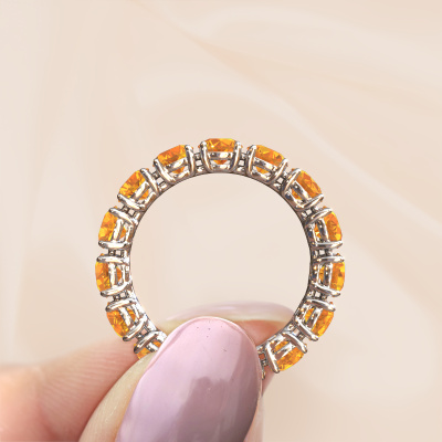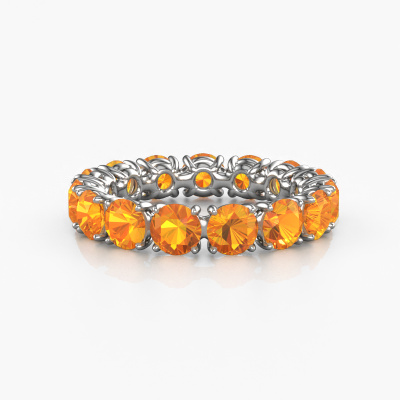 Das ist unser Vivienne 4.2-Ring. Dieser spezielle Typ wird als Eternity ring bezeichnet und ist mit einer durchgehenden Linie von identisch geschliffenen Edelsteinen besetzt. Er ist aus 14 Karat Weißgold und mit kleineren Citrin 4.2 mm besetzt. Dieser Weißgold Eternity Ring ist eine wunderschöne und sinnvolle Möglichkeit, Ihrem Antrag eine besondere Note zu verleihen. Die herrlich gleichmäßig geformten Citrin sind rund um den Ring eingefasst. Die identischen Citrin werden sorgfältig ausgewählt, um dem Ring eine maximale Wirkung zu verleihen. Denken Sie daran, dass wir natürliche Ressourcen verwenden. Daher sind kleine Unterschiede zwischen den Steinen üblich. Der besondere Effekt wird durch die präzise Positionierung der Citrin noch verstärkt. Dies erfordert äußerste Präzision und eine geschickte Hand. Für unsere erfahrenen Juweliere ist die pure Leidenschaft. Am Ende bekommen Sie einen Ring mit einer Reihe von Citrin, die weder Anfang noch Ende zu haben scheinen. Das perfekte Symbol für Ihre Liebe zu ihr! Ist sie nicht eine Schönheit? Durch die Kombination modernster Technik mit uralter Handwerkskunst können wir alle Ringe in unserem eigenen Studio anfertigen. Jedes Schmuckstück wird auf Anfrage gefertigt. Das ist vorteilhaft, weil wir Ihnen dadurch einen Preis anbieten können, den Sie nirgendwo anders finden.