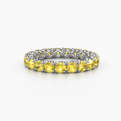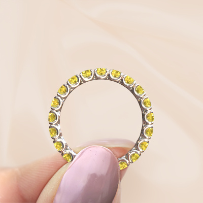 Das ist unser Estee 2.9-Ring. Dieser spezielle Typ wird als Eternity ring bezeichnet und ist mit einer durchgehenden Linie von identisch geschliffenen Edelsteinen besetzt. Er ist aus 14 Karat Weißgold und mit kleineren Gelb Saphir 2.9 mm besetzt. Dieser Weißgold Eternity Ring ist eine wunderschöne und sinnvolle Möglichkeit, Ihrem Antrag eine besondere Note zu verleihen. Die herrlich gleichmäßig geformten Gelb Saphir sind rund um den Ring eingefasst. Die identischen Gelb Saphir werden sorgfältig ausgewählt, um dem Ring eine maximale Wirkung zu verleihen. Denken Sie daran, dass wir natürliche Ressourcen verwenden. Daher sind kleine Unterschiede zwischen den Steinen üblich. Der besondere Effekt wird durch die präzise Positionierung der Gelb Saphir noch verstärkt. Dies erfordert äußerste Präzision und eine geschickte Hand. Für unsere erfahrenen Juweliere ist die pure Leidenschaft. Am Ende bekommen Sie einen Vorsteckring mit einer Reihe von Gelb Saphir, die weder Anfang noch Ende zu haben scheinen. Das perfekte Symbol für Ihre Liebe zu ihr! Ist sie nicht eine Schönheit? Da wir unsere eigenen Ringe entwerfen und liefern, können wir Ihnen einen Ring zu einem Preis anbieten, den Sie nirgendwo anders finden. Ein Ring wird auf Bestellung angefertigt, wodurch kein überschüssiges Material anfällt. So können wir Ihnen ein gutes Angebot zum besten Preis machen. Wir verstehen, dass es sich riskant anfühlt, Ihren Ring online zu kaufen. Jedoch helfen wir Ihnen gerne beim Designprozess unter Berücksichtigung Ihres Budgets.Unser Team von talentierten, leidenschaftlichen Designern fügt unserer Online-Kollektion täglich neue Ringe-Designs hinzu. Unser Ziel dabei ist es, Ihnen eine große Vielfalt an Schmuckstücken anbieten zu können. Bitte zögern Sie nicht, ein Angebot anzufordern, wenn Sie spezielle Wünsche für Ihren Ring haben. Wir garantieren Ihnen ein Angebot, das Sie nicht ablehnen können.Um es einfacher zu machen, bieten wir eine kostenlose 30-tägige Rücksendung.