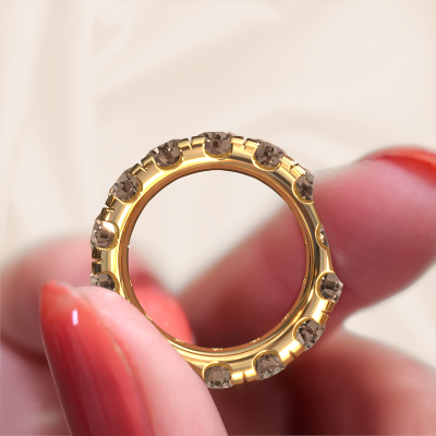 Das ist unser Jackie 4.7-Ring. Dieser spezielle Typ wird als eternity Ring bezeichnet und ist mit einer durchgehenden Linie von identisch geschliffenen Edelsteinen besetzt. Er ist aus 14 Karat Gold und mit kleineren 0.40 crt Braune Diamanten besetzt. Die erstaunlichen Braune Diamanten sind identisch in der Größe und im Ringband platziert. Unsere Braune Diamanten werden sorgfältig ausgewählt, damit sie identisch sind und somit das beste Ergebnis erzielen. Um das beste Ergebnis zu erzielen, positioniert unser Juwelier alle Braune Diamanten von Hand und mit größter Sorgfalt. Unsere Juweliere haben nur ein Ziel, nämlich den perfekten Ring zu kreieren. Deshalb lieben wir, was wir tun. Am Ende bekommen Sie einen atemberaubenden, exklusive Gold Vorsteckring mit einer Reihe von Braune Diamanten, die weder Anfang noch Ende zu haben scheinen. Das perfekte Symbol für Ihre unsterbliche Liebe zu ihr! Ist sie nicht eine Schönheit? Da wir unsere eigenen Ringe entwerfen und liefern, können wir Ihnen einen Ring zu einem Preis anbieten, den Sie nirgendwo anders finden. Ein Ring wird auf Bestellung angefertigt, wodurch kein überschüssiges Material anfällt. So können wir Ihnen ein gutes Angebot zum besten Preis machen. Wir verstehen, dass es sich riskant anfühlt, Ihren Ring online zu kaufen. Jedoch helfen wir Ihnen gerne beim Designprozess unter Berücksichtigung Ihres Budgets.Unser Team von talentierten, leidenschaftlichen Designern fügt unserer Online-Kollektion täglich neue Ringe-Designs hinzu. Unser Ziel dabei ist es, Ihnen eine große Vielfalt an Schmuckstücken anbieten zu können. Bitte zögern Sie nicht, ein Angebot anzufordern, wenn Sie spezielle Wünsche für Ihren Ring haben. Wir garantieren Ihnen ein Angebot, das Sie nicht ablehnen können.Um es einfacher zu machen, bieten wir eine kostenlose 30-tägige Rücksendung.