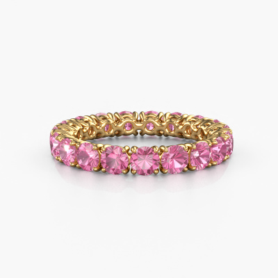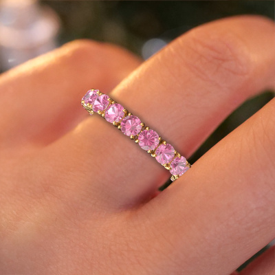 Das ist unser Vivienne 3.4-Ring. Dieser spezielle Typ wird als eternity Ring bezeichnet und ist mit einer durchgehenden Linie von identisch geschliffenen Edelsteinen besetzt. Er ist aus 14 Karat Gold und mit kleineren 3.4 mm Pink Saphir besetzt. Die erstaunlichen Pink Saphir sind identisch in der Größe und im Ringband platziert. Unsere Pink Saphir werden sorgfältig ausgewählt, damit sie identisch sind und somit das beste Ergebnis erzielen. Um das beste Ergebnis zu erzielen, positioniert unser Juwelier alle Pink Saphir von Hand und mit größter Sorgfalt. Unsere Juweliere haben nur ein Ziel, nämlich den perfekten Ring zu kreieren. Deshalb lieben wir, was wir tun. Am Ende bekommen Sie einen atemberaubenden, klassische Gold Vorsteckring mit einer Reihe von Pink Saphir, die weder Anfang noch Ende zu haben scheinen. Das perfekte Symbol für Ihre unsterbliche Liebe zu ihr! Ist sie nicht eine Schönheit? Haben Sie ein bestimmtes Budget? Sie können uns gerne kontaktieren, damit wir Ihre Optionen besprechen können. Wir bieten unsere Ringe zum garantiert besten Preis, denn wir fertigen sie auf Bestellung. Solche Preise finden Sie nirgendwo anders!Unser Team von talentierten, leidenschaftlichen Designern fügt unserer Online-Kollektion täglich neue Ring-Designs hinzu. Unser Ziel dabei ist es, Ihnen eine große Vielfalt an Schmuckstücken anbieten zu können. Bitte zögern Sie nicht, ein Angebot anzufordern, wenn Sie spezielle Wünsche für Ihren Ring haben. Wir garantieren Ihnen ein Angebot, das Sie nicht ablehnen können.Um es einfacher zu machen, bieten wir eine kostenlose 30-tägige Rücksendung.