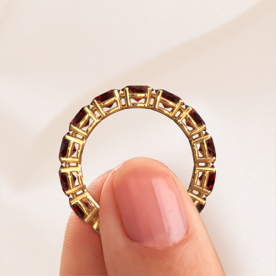 Das ist unser Vivienne OVL 5x4-Ring. Dieser spezielle Typ wird als Eternity ring bezeichnet und ist mit einer durchgehenden Linie von identisch geschliffenen Edelsteinen besetzt. Er ist aus 14 Karat Gold und mit kleineren Granat 5x4 mm besetzt. Dieser Gold Eternity Ring ist eine wunderschöne und sinnvolle Möglichkeit, Ihrem Antrag eine besondere Note zu verleihen. Die herrlich gleichmäßig geformten Granat sind rund um den Ring eingefasst. Die identischen Granat werden sorgfältig ausgewählt, um dem Ring eine maximale Wirkung zu verleihen. Denken Sie daran, dass wir natürliche Ressourcen verwenden. Daher sind kleine Unterschiede zwischen den Steinen üblich. Der besondere Effekt wird durch die präzise Positionierung der Granat noch verstärkt. Dies erfordert äußerste Präzision und eine geschickte Hand. Für unsere erfahrenen Juweliere ist die pure Leidenschaft. Am Ende bekommen Sie einen Ring mit einer Reihe von Granat, die weder Anfang noch Ende zu haben scheinen. Das perfekte Symbol für Ihre Liebe zu ihr! Ist sie nicht eine Schönheit? Mit unserer modernen Technik können wir Schmuckstücke von höchster Qualität mit größter Sorgfalt für Sie entwerfen und anpassen. Unsere Ringe sind immer um 30 Prozent günstiger als bei anderen Juwelieren. Wir fertigen Ringe auf Bestellung, also müssen wir keine großen Lager unterhalten. Wenn Sie ein bestimmtes Budget haben, beraten wir Sie gerne entsprechend.Unsere Online-Kollektion wird täglich um neue Schmuckdesigns ergänzt. Unser Team von leidenschaftlichen Designern ist bemüht, außergewöhnliche und vielfältige Designs zu kreieren. Haben Sie einen Ring gesehen, der Ihnen gefällt? Setzen Sie sich mit uns in Verbindung. Basierend auf einem guten Preis/Leistungsverhältnis machen wir Ihnen ein Angebot, das Sie nicht ablehnen können!Um es einfacher zu machen, bieten wir eine kostenlose 30-tägige Rücksendung.