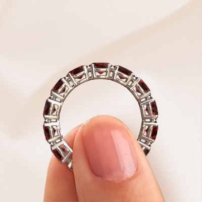 Das ist unser Vivienne OVL 5x4-Ring. Dieser spezielle Typ wird als Eternity ring bezeichnet und ist mit einer durchgehenden Linie von identisch geschliffenen Edelsteinen besetzt. Er ist aus 14 Karat Weißgold und mit kleineren Granat 5x4 mm besetzt. Dieser Weißgold Eternity Ring ist eine wunderschöne und sinnvolle Möglichkeit, Ihrem Antrag eine besondere Note zu verleihen. Die herrlich gleichmäßig geformten Granat sind rund um den Ring eingefasst. Die identischen Granat werden sorgfältig ausgewählt, um dem Ring eine maximale Wirkung zu verleihen. Denken Sie daran, dass wir natürliche Ressourcen verwenden. Daher sind kleine Unterschiede zwischen den Steinen üblich. Der besondere Effekt wird durch die präzise Positionierung der Granat noch verstärkt. Dies erfordert äußerste Präzision und eine geschickte Hand. Für unsere erfahrenen Juweliere ist die pure Leidenschaft. Am Ende bekommen Sie einen Ring mit einer Reihe von Granat, die weder Anfang noch Ende zu haben scheinen. Das perfekte Symbol für Ihre Liebe zu ihr! Ist sie nicht eine Schönheit? Mit unserer modernen Technik können wir Schmuckstücke von höchster Qualität mit größter Sorgfalt für Sie entwerfen und anpassen. Unsere Ringe sind immer um 30 Prozent günstiger als bei anderen Juwelieren. Wir fertigen Ringe auf Bestellung, also müssen wir keine großen Lager unterhalten. Wenn Sie ein bestimmtes Budget haben, beraten wir Sie gerne entsprechend.Unsere Online-Kollektion wird täglich um neue Schmuckdesigns ergänzt. Unser Team von leidenschaftlichen Designern ist bemüht, außergewöhnliche und vielfältige Designs zu kreieren. Haben Sie einen Ring gesehen, der Ihnen gefällt? Setzen Sie sich mit uns in Verbindung. Basierend auf einem guten Preis/Leistungsverhältnis machen wir Ihnen ein Angebot, das Sie nicht ablehnen können!Um es einfacher zu machen, bieten wir eine kostenlose 30-tägige Rücksendung.