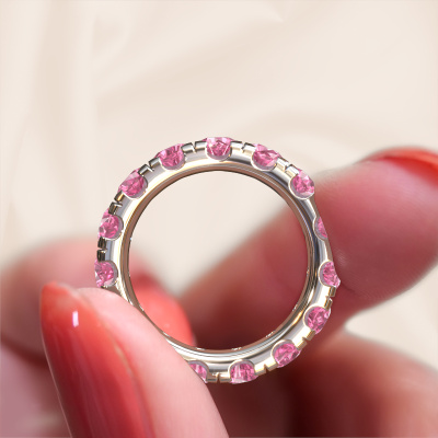 Das ist unser Jackie 4.2-Ring. Dieser spezielle Typ wird als Eternity ring bezeichnet und ist mit einer durchgehenden Linie von identisch geschliffenen Edelsteinen besetzt. Er ist aus Platin und mit kleineren Pink Saphir 4.2 mm besetzt. Dieser Platin Eternity Ring ist eine wunderschöne und sinnvolle Möglichkeit, Ihrem Antrag eine besondere Note zu verleihen. Die herrlich gleichmäßig geformten Pink Saphir sind rund um den Ring eingefasst. Die identischen Pink Saphir werden sorgfältig ausgewählt, um dem Ring eine maximale Wirkung zu verleihen. Denken Sie daran, dass wir natürliche Ressourcen verwenden. Daher sind kleine Unterschiede zwischen den Steinen üblich. Der besondere Effekt wird durch die präzise Positionierung der Pink Saphir noch verstärkt. Dies erfordert äußerste Präzision und eine geschickte Hand. Für unsere erfahrenen Juweliere ist die pure Leidenschaft. Am Ende bekommen Sie einen Vorsteckring mit einer Reihe von Pink Saphir, die weder Anfang noch Ende zu haben scheinen. Das perfekte Symbol für Ihre Liebe zu ihr! Ist sie nicht eine Schönheit? Nachdem Sie Ihre Bestellung aufgegeben haben, beginnen unsere Goldschmiede mit dem kreativen Prozess der Herstellung Ihres Jackie 4.2 Ring. Wir haben keine Lager. Das ist vorteilhaft, da diese Kosten nicht an Sie weitergegeben werden. Daher sind wir in der Lage, Schmuck zu außergewöhnlich niedrigen Preisen anzubieten.Unsere Online-Kollektion wird täglich um neue Schmuckdesigns ergänzt. Unser Team von leidenschaftlichen Designern ist bemüht, außergewöhnliche und vielfältige Designs zu kreieren. Haben Sie einen Ring gesehen, der Ihnen gefällt? Setzen Sie sich mit uns in Verbindung. Basierend auf einem guten Preis/Leistungsverhältnis machen wir Ihnen ein Angebot, das Sie nicht ablehnen können!Um es einfacher zu machen, bieten wir eine kostenlose 30-tägige Rücksendung.