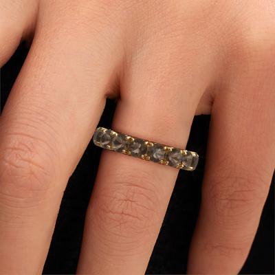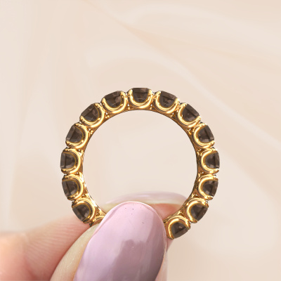 Dieser Estee 4.0 Ring in 14 Karat Gold ist mit Rauchquarz besetzt. Dieser Gold Estee 4.0 Ring ist die perfekte Ergänzung zu Ihrer Ring-Kollektion! Wie der Name schon sagt, ist es ein Ring, der an einem Finger mit einem anderen Ring kombiniert werden kann. Das gibt Ihnen die Möglichkeit, Ihren eigenen Stil zu schaffen. Ein Ring repräsentiert normalerweise eine bestimmte Erinnerung an jemand Besonderen, oder an einen denkwürdigen Moment. Es ist üblich, einen Ring, welcher ein Jubiläum darstellt, mit einem Trauring zu kombinieren. Aber dieser eternity Ring, kombiniert mit Ihren anderen Ringen, ist auch ein klassisches Modeobjekt. Sobald Sie Ihren Estee 4.0 Ring mit unserem Online-Tool fertiggestellt haben, beginnen unsere Goldschmiede mit der kreativen Anfertigung Ihres Ringes. Dieser wird mit Leidenschaft und Sorgfalt nach alter Handwerkskunst gefertigt. Darüber hinaus sind unsere Edelsteine ehrlich gewonnen. Wenn Sie spezielle Änderungen an Ihrem Estee 4.0 Ring vornehmen möchten, die in unserem Online-Tool nicht verfügbar sind, wenden Sie sich bitte an unsere Experten.Mit unserer modernen Technik können wir Schmuckstücke von höchster Qualität mit größter Sorgfalt für Sie entwerfen und anpassen. Unsere Ringe sind immer um 30 Prozent günstiger als bei anderen Juwelieren. Wir fertigen Ringe auf Bestellung, also müssen wir keine großen Lager unterhalten. Wenn Sie ein bestimmtes Budget haben, beraten wir Sie gerne entsprechend.Um es einfacher zu machen, bieten wir eine kostenlose 30-tägige Rücksendung.