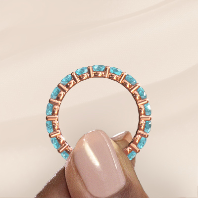 Das ist unser Heddy rnd 3.4-Ring. Dieser spezielle Typ wird als eternity Ring bezeichnet und ist mit einer durchgehenden Linie von identisch geschliffenen Edelsteinen besetzt. Er ist aus 14 Karat Roségold und mit kleineren 3.4 mm Blaue Topas besetzt. Die erstaunlichen Blaue Topas sind identisch in der Größe und im Ringband platziert. Unsere Blaue Topas werden sorgfältig ausgewählt, damit sie identisch sind und somit das beste Ergebnis erzielen. Um das beste Ergebnis zu erzielen, positioniert unser Juwelier alle Blaue Topas von Hand und mit größter Sorgfalt. Unsere Juweliere haben nur ein Ziel, nämlich den perfekten Ring zu kreieren. Deshalb lieben wir, was wir tun. Am Ende bekommen Sie einen atemberaubenden, moderne Roségold Ring mit einer Reihe von Blaue Topas, die weder Anfang noch Ende zu haben scheinen. Das perfekte Symbol für Ihre unsterbliche Liebe zu ihr! Ist sie nicht eine Schönheit? Nach Erhalt Ihrer Bestellung beginnen unsere Goldschmiede mit Leidenschaft den kreativen Prozess und fertigen Ihren Ring in unserem eigenen Studio. Da wir keine großen Lager haben, werden diese Kosten nicht an Sie weitergegeben. Unsere Preisgestaltung ist der Beweis dafür! Wir bieten Schmuck zum niedrigsten Preis, garantiert.Unsere talentierten, leidenschaftlichen Designer fügen unserer Online-Kollektion täglich neue Designs hinzu. Zusammen versuchen sie, eine vielfältige Kollektion feinster Schmuckstücke zu erstellen. Wenn Sie es vorziehen, einen Ring nach Ihrem eigenen Entwurf zu machen, können Sie gerne ein Angebot anfordern. Wir machen Ihnen ein großartiges Angebot, basierend auf Qualität und Preis.Um es einfacher zu machen, bieten wir eine kostenlose 30-tägige Rücksendung.