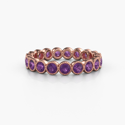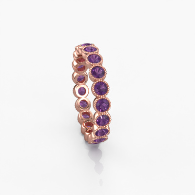 Das ist unser Mariam 0.07-Ring. Dieser spezielle Typ wird als eternity Ring bezeichnet und ist mit einer durchgehenden Linie von identisch geschliffenen Edelsteinen besetzt. Er ist aus 14 Karat Roségold und mit kleineren 2.7 mm Amethysten besetzt. Die erstaunlichen Amethysten sind identisch in der Größe und im Ringband platziert. Unsere Amethysten werden sorgfältig ausgewählt, damit sie identisch sind und somit das beste Ergebnis erzielen. Um das beste Ergebnis zu erzielen, positioniert unser Juwelier alle Amethysten von Hand und mit größter Sorgfalt. Unsere Juweliere haben nur ein Ziel, nämlich den perfekten Ring zu kreieren. Deshalb lieben wir, was wir tun. Am Ende bekommen Sie einen atemberaubenden, trendige Roségold Ring mit einer Reihe von Amethysten, die weder Anfang noch Ende zu haben scheinen. Das perfekte Symbol für Ihre unsterbliche Liebe zu ihr! Ist sie nicht eine Schönheit? Nach Erhalt Ihrer Bestellung beginnen unsere Goldschmiede mit Leidenschaft den kreativen Prozess und fertigen Ihren Ring in unserem eigenen Studio. Da wir keine großen Lager haben, werden diese Kosten nicht an Sie weitergegeben. Unsere Preisgestaltung ist der Beweis dafür! Wir bieten Schmuck zum niedrigsten Preis, garantiert.Unsere talentierten, leidenschaftlichen Designer fügen unserer Online-Kollektion täglich neue Designs hinzu. Zusammen versuchen sie, eine vielfältige Kollektion feinster Schmuckstücke zu erstellen. Wenn Sie es vorziehen, einen Ring nach Ihrem eigenen Entwurf zu machen, können Sie gerne ein Angebot anfordern. Wir machen Ihnen ein großartiges Angebot, basierend auf Qualität und Preis.Um es einfacher zu machen, bieten wir eine kostenlose 30-tägige Rücksendung.