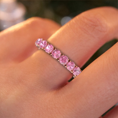 Das ist unser Vivienne 3.4-Ring. Dieser spezielle Typ wird als eternity Ring bezeichnet und ist mit einer durchgehenden Linie von identisch geschliffenen Edelsteinen besetzt. Er ist aus 14 Karat Roségold und mit kleineren 3.4 mm Pink Saphir besetzt. Die erstaunlichen Pink Saphir sind identisch in der Größe und im Ringband platziert. Unsere Pink Saphir werden sorgfältig ausgewählt, damit sie identisch sind und somit das beste Ergebnis erzielen. Um das beste Ergebnis zu erzielen, positioniert unser Juwelier alle Pink Saphir von Hand und mit größter Sorgfalt. Unsere Juweliere haben nur ein Ziel, nämlich den perfekten Ring zu kreieren. Deshalb lieben wir, was wir tun. Am Ende bekommen Sie einen atemberaubenden, klassische Roségold Vorsteckring mit einer Reihe von Pink Saphir, die weder Anfang noch Ende zu haben scheinen. Das perfekte Symbol für Ihre unsterbliche Liebe zu ihr! Ist sie nicht eine Schönheit? Haben Sie ein bestimmtes Budget? Sie können uns gerne kontaktieren, damit wir Ihre Optionen besprechen können. Wir bieten unsere Ringe zum garantiert besten Preis, denn wir fertigen sie auf Bestellung. Solche Preise finden Sie nirgendwo anders!Unser Team von talentierten, leidenschaftlichen Designern fügt unserer Online-Kollektion täglich neue Ring-Designs hinzu. Unser Ziel dabei ist es, Ihnen eine große Vielfalt an Schmuckstücken anbieten zu können. Bitte zögern Sie nicht, ein Angebot anzufordern, wenn Sie spezielle Wünsche für Ihren Ring haben. Wir garantieren Ihnen ein Angebot, das Sie nicht ablehnen können.Um es einfacher zu machen, bieten wir eine kostenlose 30-tägige Rücksendung.