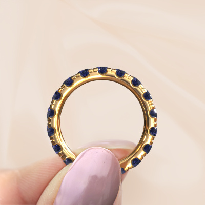 Das ist unser Jackie 3.4-Ring. Dieser spezielle Typ wird als Eternity ring bezeichnet und ist mit einer durchgehenden Linie von identisch geschliffenen Edelsteinen besetzt. Er ist aus 14 Karat Gold und mit kleineren Saphir 3.4 mm besetzt. Dieser Gold Eternity Ring ist eine wunderschöne und sinnvolle Möglichkeit, Ihrem Antrag eine besondere Note zu verleihen. Die herrlich gleichmäßig geformten Saphir sind rund um den Ring eingefasst. Die identischen Saphir werden sorgfältig ausgewählt, um dem Ring eine maximale Wirkung zu verleihen. Denken Sie daran, dass wir natürliche Ressourcen verwenden. Daher sind kleine Unterschiede zwischen den Steinen üblich. Der besondere Effekt wird durch die präzise Positionierung der Saphir noch verstärkt. Dies erfordert äußerste Präzision und eine geschickte Hand. Für unsere erfahrenen Juweliere ist die pure Leidenschaft. Am Ende bekommen Sie einen Vorsteckring mit einer Reihe von Saphir, die weder Anfang noch Ende zu haben scheinen. Das perfekte Symbol für Ihre Liebe zu ihr! Ist sie nicht eine Schönheit? Nach Erhalt Ihrer Bestellung beginnen unsere Goldschmiede mit Leidenschaft den kreativen Prozess und fertigen Ihren Ring in unserem eigenen Studio. Da wir keine großen Lager haben, werden diese Kosten nicht an Sie weitergegeben. Unsere Preisgestaltung ist der Beweis dafür! Wir bieten Schmuck zum niedrigsten Preis, garantiert.Unsere talentierten, leidenschaftlichen Designer fügen unserer Online-Kollektion täglich neue Designs hinzu. Zusammen versuchen sie, eine vielfältige Kollektion feinster Schmuckstücke zu erstellen. Wenn Sie es vorziehen, einen Ring nach Ihrem eigenen Entwurf zu machen, können Sie gerne ein Angebot anfordern. Wir machen Ihnen ein großartiges Angebot, basierend auf Qualität und Preis.Um es einfacher zu machen, bieten wir eine kostenlose 30-tägige Rücksendung.