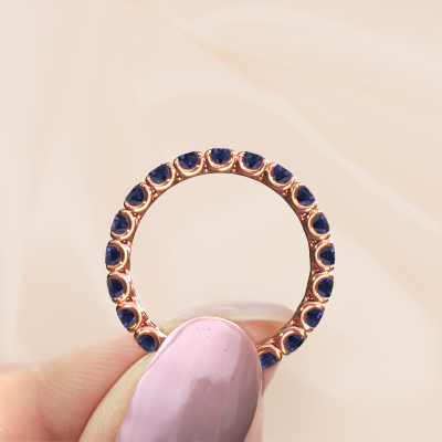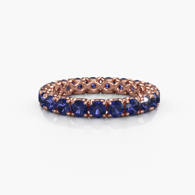 Das ist unser Estee 2.9-Ring. Dieser spezielle Typ wird als Eternity ring bezeichnet und ist mit einer durchgehenden Linie von identisch geschliffenen Edelsteinen besetzt. Er ist aus 14 Karat Roségold und mit kleineren Saphir 2.9 mm besetzt. Dieser Roségold Eternity Ring ist eine wunderschöne und sinnvolle Möglichkeit, Ihrem Antrag eine besondere Note zu verleihen. Die herrlich gleichmäßig geformten Saphir sind rund um den Ring eingefasst. Die identischen Saphir werden sorgfältig ausgewählt, um dem Ring eine maximale Wirkung zu verleihen. Denken Sie daran, dass wir natürliche Ressourcen verwenden. Daher sind kleine Unterschiede zwischen den Steinen üblich. Der besondere Effekt wird durch die präzise Positionierung der Saphir noch verstärkt. Dies erfordert äußerste Präzision und eine geschickte Hand. Für unsere erfahrenen Juweliere ist die pure Leidenschaft. Am Ende bekommen Sie einen Vorsteckring mit einer Reihe von Saphir, die weder Anfang noch Ende zu haben scheinen. Das perfekte Symbol für Ihre Liebe zu ihr! Ist sie nicht eine Schönheit? Da wir unsere eigenen Ringe entwerfen und liefern, können wir Ihnen einen Ring zu einem Preis anbieten, den Sie nirgendwo anders finden. Ein Ring wird auf Bestellung angefertigt, wodurch kein überschüssiges Material anfällt. So können wir Ihnen ein gutes Angebot zum besten Preis machen. Wir verstehen, dass es sich riskant anfühlt, Ihren Ring online zu kaufen. Jedoch helfen wir Ihnen gerne beim Designprozess unter Berücksichtigung Ihres Budgets.Unser Team von talentierten, leidenschaftlichen Designern fügt unserer Online-Kollektion täglich neue Ringe-Designs hinzu. Unser Ziel dabei ist es, Ihnen eine große Vielfalt an Schmuckstücken anbieten zu können. Bitte zögern Sie nicht, ein Angebot anzufordern, wenn Sie spezielle Wünsche für Ihren Ring haben. Wir garantieren Ihnen ein Angebot, das Sie nicht ablehnen können.Um es einfacher zu machen, bieten wir eine kostenlose 30-tägige Rücksendung.