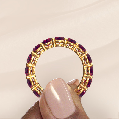 Das ist unser Michelle full 4.0-Ring. Dieser spezielle Typ wird als eternity Ring bezeichnet und ist mit einer durchgehenden Linie von identisch geschliffenen Edelsteinen besetzt. Er ist aus 14 Karat Gold und mit kleineren 4 mm Rhodolit besetzt. Die erstaunlichen Rhodolit sind identisch in der Größe und im Ringband platziert. Unsere Rhodolit werden sorgfältig ausgewählt, damit sie identisch sind und somit das beste Ergebnis erzielen. Um das beste Ergebnis zu erzielen, positioniert unser Juwelier alle Rhodolit von Hand und mit größter Sorgfalt. Unsere Juweliere haben nur ein Ziel, nämlich den perfekten Ring zu kreieren. Deshalb lieben wir, was wir tun. Am Ende bekommen Sie einen atemberaubenden, moderne Gold Vorsteckring mit einer Reihe von Rhodolit, die weder Anfang noch Ende zu haben scheinen. Das perfekte Symbol für Ihre unsterbliche Liebe zu ihr! Ist sie nicht eine Schönheit? Durch die Kombination modernster Technik mit uralter Handwerkskunst können wir alle Ringe in unserem eigenen Studio anfertigen. Jedes Schmuckstück wird auf Anfrage gefertigt. Das ist vorteilhaft, weil wir Ihnen dadurch einen Preis anbieten können, den Sie nirgendwo anders finden.Unsere talentierten, leidenschaftlichen Designer fügen unserer Online-Kollektion täglich neue Designs hinzu. Zusammen versuchen sie, eine vielfältige Kollektion feinster Schmuckstücke zu erstellen. Wenn Sie es vorziehen, einen Ring nach Ihrem eigenen Entwurf zu machen, können Sie gerne ein Angebot anfordern. Wir machen Ihnen ein großartiges Angebot, basierend auf Qualität und Preis.Um es einfacher zu machen, bieten wir eine kostenlose 30-tägige Rücksendung.