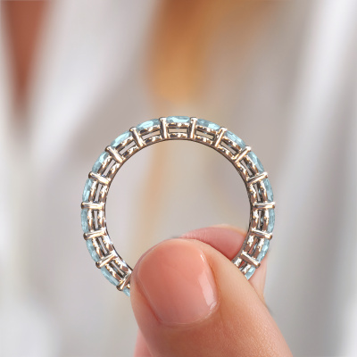 Das ist unser Heddy OVL 3.5x4.5-Ring. Dieser spezielle Typ wird als eternity Ring bezeichnet und ist mit einer durchgehenden Linie von identisch geschliffenen Edelsteinen besetzt. Er ist aus 14 Karat Weißgold und mit kleineren 4.5x3.5 mm Aquamarins besetzt. Die erstaunlichen Aquamarins sind identisch in der Größe und im Ringband platziert. Unsere Aquamarins werden sorgfältig ausgewählt, damit sie identisch sind und somit das beste Ergebnis erzielen. Um das beste Ergebnis zu erzielen, positioniert unser Juwelier alle Aquamarins von Hand und mit größter Sorgfalt. Unsere Juweliere haben nur ein Ziel, nämlich den perfekten Ring zu kreieren. Deshalb lieben wir, was wir tun. Am Ende bekommen Sie einen atemberaubenden, Fantasie Weißgold Vorsteckring mit einer Reihe von Aquamarins, die weder Anfang noch Ende zu haben scheinen. Das perfekte Symbol für Ihre unsterbliche Liebe zu ihr! Ist sie nicht eine Schönheit? Durch die Kombination modernster Technik mit uralter Handwerkskunst können wir alle Ringe in unserem eigenen Studio anfertigen. Jedes Schmuckstück wird auf Anfrage gefertigt. Das ist vorteilhaft, weil wir Ihnen dadurch einen Preis anbieten können, den Sie nirgendwo anders finden.Unser Team von talentierten, leidenschaftlichen Designern fügt unserer Online-Kollektion täglich neue Ringe-Designs hinzu. Unser Ziel dabei ist es, Ihnen eine große Vielfalt an Schmuckstücken anbieten zu können. Bitte zögern Sie nicht, ein Angebot anzufordern, wenn Sie spezielle Wünsche für Ihren Ring haben. Wir garantieren Ihnen ein Angebot, das Sie nicht ablehnen können.Um es einfacher zu machen, bieten wir eine kostenlose 30-tägige Rücksendung.