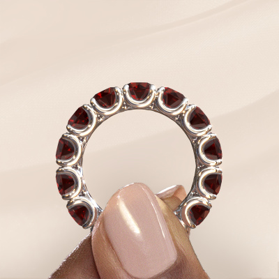 Das ist unser Estee 5.0-Ring. Dieser spezielle Typ wird als eternity Ring bezeichnet und ist mit einer durchgehenden Linie von identisch geschliffenen Edelsteinen besetzt. Er ist aus 14 Karat Weißgold und mit kleineren 5 mm Granat besetzt. Die erstaunlichen Granat sind identisch in der Größe und im Ringband platziert. Unsere Granat werden sorgfältig ausgewählt, damit sie identisch sind und somit das beste Ergebnis erzielen. Um das beste Ergebnis zu erzielen, positioniert unser Juwelier alle Granat von Hand und mit größter Sorgfalt. Unsere Juweliere haben nur ein Ziel, nämlich den perfekten Ring zu kreieren. Deshalb lieben wir, was wir tun. Am Ende bekommen Sie einen atemberaubenden, exklusive Weißgold Ring mit einer Reihe von Granat, die weder Anfang noch Ende zu haben scheinen. Das perfekte Symbol für Ihre unsterbliche Liebe zu ihr! Ist sie nicht eine Schönheit? Haben Sie ein bestimmtes Budget? Sie können uns gerne kontaktieren, damit wir Ihre Optionen besprechen können. Wir bieten unsere Ringe zum garantiert besten Preis, denn wir fertigen sie auf Bestellung. Solche Preise finden Sie nirgendwo anders!Unsere talentierten, leidenschaftlichen Designer fügen unserer Online-Kollektion täglich neue Designs hinzu. Zusammen versuchen sie, eine vielfältige Kollektion feinster Schmuckstücke zu erstellen. Wenn Sie es vorziehen, einen Ring nach Ihrem eigenen Entwurf zu machen, können Sie gerne ein Angebot anfordern. Wir machen Ihnen ein großartiges Angebot, basierend auf Qualität und Preis.Um es einfacher zu machen, bieten wir eine kostenlose 30-tägige Rücksendung.