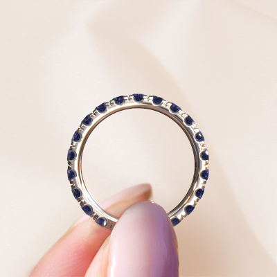 Das ist unser Jackie 2.7-Ring. Dieser spezielle Typ wird als eternity Ring bezeichnet und ist mit einer durchgehenden Linie von identisch geschliffenen Edelsteinen besetzt. Er ist aus 14 Karat Weißgold und mit kleineren 2.7 mm Saphir besetzt. Die erstaunlichen Saphir sind identisch in der Größe und im Ringband platziert. Unsere Saphir werden sorgfältig ausgewählt, damit sie identisch sind und somit das beste Ergebnis erzielen. Um das beste Ergebnis zu erzielen, positioniert unser Juwelier alle Saphir von Hand und mit größter Sorgfalt. Unsere Juweliere haben nur ein Ziel, nämlich den perfekten Ring zu kreieren. Deshalb lieben wir, was wir tun. Am Ende bekommen Sie einen atemberaubenden, moderne Weißgold Vorsteckring mit einer Reihe von Saphir, die weder Anfang noch Ende zu haben scheinen. Das perfekte Symbol für Ihre unsterbliche Liebe zu ihr! Ist sie nicht eine Schönheit? Da wir unsere eigenen Ringe entwerfen und liefern, können wir Ihnen einen Ring zu einem Preis anbieten, den Sie nirgendwo anders finden. Ein Ring wird auf Bestellung angefertigt, wodurch kein überschüssiges Material anfällt. So können wir Ihnen ein gutes Angebot zum besten Preis machen. Wir verstehen, dass es sich riskant anfühlt, Ihren Ring online zu kaufen. Jedoch helfen wir Ihnen gerne beim Designprozess unter Berücksichtigung Ihres Budgets.Unser Team von talentierten, leidenschaftlichen Designern fügt unserer Online-Kollektion täglich neue Ringe-Designs hinzu. Unser Ziel dabei ist es, Ihnen eine große Vielfalt an Schmuckstücken anbieten zu können. Bitte zögern Sie nicht, ein Angebot anzufordern, wenn Sie spezielle Wünsche für Ihren Ring haben. Wir garantieren Ihnen ein Angebot, das Sie nicht ablehnen können.Um es einfacher zu machen, bieten wir eine kostenlose 30-tägige Rücksendung.