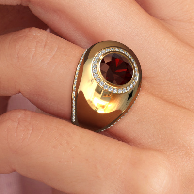 Das ist ein atemberaubender, Edelsteine Gold Roxann Ring. Er ist mit Granat besetzt. Ein Designer-Ring, passend für noble Frauen. Der Ring wurde von unseren eigenen Goldschmieden entworfen. In unserem Atelier verwenden wir eine Kombination aus den