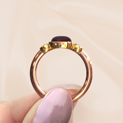 In diesem Foto ist der Roségold Liane Ring mit einem 7x5 mm oval cabochon Granat besetzt. Cabochon bedeutet, dass ein Granat zuerst geformt, nicht facettiert wird. Nämlich in eine bestimmte Form wie einen Tropfen, ein Herz oder ein oval cabochon. Anschließend wird er poliert, bis der Edelstein eine Runde Oberfläche hat. Ein Cabochon-Edelstein ist ein atemberaubender, nobler Blickfang, der perfekt zu einem zeitgenössischen wie auch zu einem Vintage-Stil passt. Unsere erfahrenen Goldschmiede formen den zierliche Ring bis zur Perfektion und machen ihn einzigartig. Der Cabochon Granat ist so gefasst, dass seine einzigartigen Qualitäten verstärkt werden. Unsere Goldschmiede kreieren Ihren individuellen Ring leidenschaftlich, mit größter Sorgfalt und nach Ihren Wünschen. Das Roségold Ring, wie hier abgebildet, kann mit unserem Online-Tool individuell angepasst werden. Bitte fragen Sie unsere Schmuckdesigner um Hilfe, wenn Sie Änderungen wünsche, die in unserem Online-Tool nicht verfügbar sind. Gerne beantworten wir Ihnen alle offenen Fragen.Durch die Kombination modernster Technik mit uralter Handwerkskunst können wir alle Ringe in unserem eigenen Studio anfertigen. Jedes Schmuckstück wird auf Anfrage gefertigt. Das ist vorteilhaft, weil wir Ihnen dadurch einen Preis anbieten können, den Sie nirgendwo anders finden.Um es einfacher zu machen, bieten wir eine kostenlose 30-tägige Rücksendung.