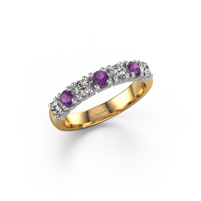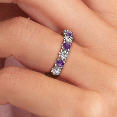 Dieser 7 Stone Ring wird Rianne 7 genannt. Diese Art von Ring wird als Memoire ring bezeichnet, da seine Edelsteine in einer durchgehenden Linie angeordnet sind. Dadurch kann er einfach mit anderen Ringen kombiniert werden. Das Band dieses 14 Karat Gold Ring ist in einer Kombination aus Amethyst und Lab-grown Diamant besetzt. Sie können ganz einfach online die Kombination auswählen, die Sie bevorzugen. Wie Sie sehen, wird bei diesem Gold Memoire Ring mehre Amethysten gesetzt. Der Memoire ring steht für Zusammenwirken. Und genau das tun diese Edelsteine, zusammenwirken. Zusammen geben sie dem Band eines traditionell Ring einen schönen Effekt! So ein bedeutungsvoller Ring, finden Sie nicht auch? Alle von uns ausgesuchten Amethysten werden von unserem erfahrenen Goldschiede in Handarbeit eingefasst. Das ist eine präzise Aufgabe, die nur durch die Kombination von purer Handwerkskunst und dem Einsatz neuester Techniken erfolgreich durchgeführt werden kann, um eine optimale Wirkung zu erzielen. Um eine perfekte Lichtreflexion zu erzeugen, müssen alle Edelsteine auf die gleiche Weise perfekt ausgerichtet sein. Während der Fertigung wird der Goldschmied Meister daher ständig die Lichtreflexion überwachen, um zu gewährleisten, dass die Amethysten perfekt ausgerichtet sind. Das erfordert eine geschickte Hand und viel Geduld, aber dann wird das Endprodukt zu einem echten Kunstwerk. Und genau das ist unsere Mission!Da wir unsere eigenen Ringe entwerfen und liefern, können wir Ihnen einen Ring zu einem Preis anbieten, den Sie nirgendwo anders finden. Ein Ring wird auf Bestellung angefertigt, wodurch kein überschüssiges Material anfällt. So können wir Ihnen ein gutes Angebot zum besten Preis machen. Wir verstehen, dass es sich riskant anfühlt, Ihren Ring online zu kaufen. Jedoch helfen wir Ihnen gerne beim Designprozess unter Berücksichtigung Ihres Budgets.
