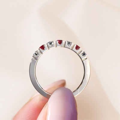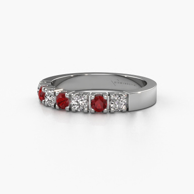 Dieser 7 Stone Ring wird Dana 7 genannt. Diese Art von Ring wird als Memoire ring bezeichnet, da seine Edelsteine in einer durchgehenden Linie angeordnet sind. Dadurch kann er einfach mit anderen Ringen kombiniert werden. Das Band dieses Platin Ring ist in einer Kombination aus Rubin und Lab-grown Diamant besetzt. Sie können ganz einfach online die Kombination auswählen, die Sie bevorzugen. Wie Sie sehen, wird bei diesem Platin Memoire Ring mehre Rubin gesetzt. Der Memoire ring steht für Zusammenwirken. Und genau das tun diese Edelsteine, zusammenwirken. Zusammen geben sie dem Band eines moderne Ring einen schönen Effekt! So ein bedeutungsvoller Ring, finden Sie nicht auch? Alle von uns ausgesuchten Rubin werden von unserem erfahrenen Goldschiede in Handarbeit eingefasst. Das ist eine präzise Aufgabe, die nur durch die Kombination von purer Handwerkskunst und dem Einsatz neuester Techniken erfolgreich durchgeführt werden kann, um eine optimale Wirkung zu erzielen. Um eine perfekte Lichtreflexion zu erzeugen, müssen alle Edelsteine auf die gleiche Weise perfekt ausgerichtet sein. Während der Fertigung wird der Goldschmied Meister daher ständig die Lichtreflexion überwachen, um zu gewährleisten, dass die Rubin perfekt ausgerichtet sind. Das erfordert eine geschickte Hand und viel Geduld, aber dann wird das Endprodukt zu einem echten Kunstwerk. Und genau das ist unsere Mission!Nach Erhalt Ihrer Bestellung beginnen unsere Goldschmiede mit Leidenschaft den kreativen Prozess und fertigen Ihren Ring in unserem eigenen Studio. Da wir keine großen Lager haben, werden diese Kosten nicht an Sie weitergegeben. Unsere Preisgestaltung ist der Beweis dafür! Wir bieten Schmuck zum niedrigsten Preis, garantiert.Unser Team von talentierten, leidenschaftlichen Designern fügt unserer Online-Kollektion täglich neue Ringe-Designs hinzu. Unser Ziel dabei ist es, Ihnen eine große Vielfalt an Schmuckstücken anbieten zu können. Bitte zögern Sie nicht, ein Angebot anzufordern, wenn Sie spezielle Wünsche für Ihren Ring haben. Wir garantieren Ihnen ein Angebot, das Sie nicht ablehnen können.Um es einfacher zu machen, bieten wir eine kostenlose 30-tägige Rücksendung.