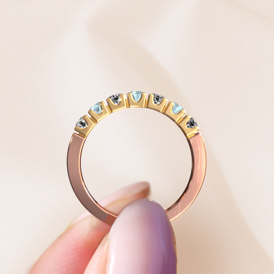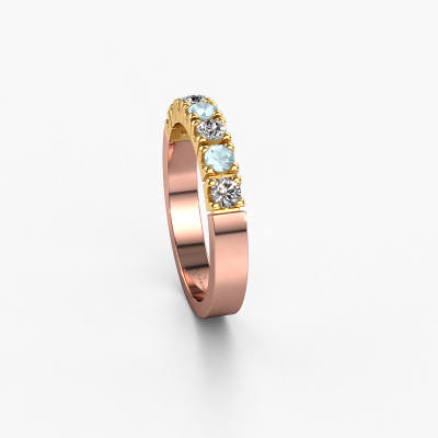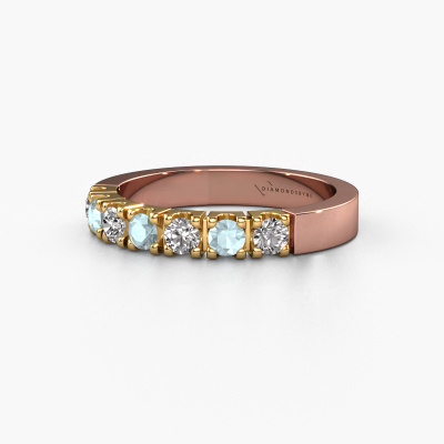 Dieser 7 Stone Ring wird Dana 7 genannt. Diese Art von Ring wird als Memoire ring bezeichnet, da seine Edelsteine in einer durchgehenden Linie angeordnet sind. Dadurch kann er einfach mit anderen Ringen kombiniert werden. Das Band dieses 14 Karat Roségold Ring ist in einer Kombination aus Aquamarin und Lab-grown Diamant besetzt. Sie können ganz einfach online die Kombination auswählen, die Sie bevorzugen. Wie Sie sehen, wird bei diesem Roségold Memoire Ring mehre Aquamarins gesetzt. Der Memoire ring steht für Zusammenwirken. Und genau das tun diese Edelsteine, zusammenwirken. Zusammen geben sie dem Band eines moderne Ring einen schönen Effekt! So ein bedeutungsvoller Ring, finden Sie nicht auch? Alle von uns ausgesuchten Aquamarins werden von unserem erfahrenen Goldschiede in Handarbeit eingefasst. Das ist eine präzise Aufgabe, die nur durch die Kombination von purer Handwerkskunst und dem Einsatz neuester Techniken erfolgreich durchgeführt werden kann, um eine optimale Wirkung zu erzielen. Um eine perfekte Lichtreflexion zu erzeugen, müssen alle Edelsteine auf die gleiche Weise perfekt ausgerichtet sein. Während der Fertigung wird der Goldschmied Meister daher ständig die Lichtreflexion überwachen, um zu gewährleisten, dass die Aquamarins perfekt ausgerichtet sind. Das erfordert eine geschickte Hand und viel Geduld, aber dann wird das Endprodukt zu einem echten Kunstwerk. Und genau das ist unsere Mission!Nach Erhalt Ihrer Bestellung beginnen unsere Goldschmiede mit Leidenschaft den kreativen Prozess und fertigen Ihren Ring in unserem eigenen Studio. Da wir keine großen Lager haben, werden diese Kosten nicht an Sie weitergegeben. Unsere Preisgestaltung ist der Beweis dafür! Wir bieten Schmuck zum niedrigsten Preis, garantiert.Unser Team von talentierten, leidenschaftlichen Designern fügt unserer Online-Kollektion täglich neue Ringe-Designs hinzu. Unser Ziel dabei ist es, Ihnen eine große Vielfalt an Schmuckstücken anbieten zu können. Bitte zögern Sie nicht, ein Angebot anzufordern, wenn Sie spezielle Wünsche für Ihren Ring haben. Wir garantieren Ihnen ein Angebot, das Sie nicht ablehnen können.Um es einfacher zu machen, bieten wir eine kostenlose 30-tägige Rücksendung.