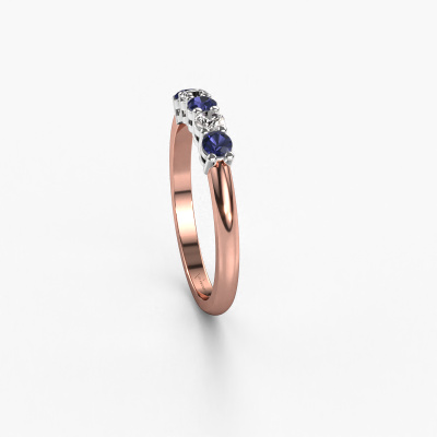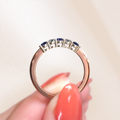 Dieser 5 Stone Ring wird Michelle 5 genannt. Diese Art von Ring wird als Memoire ring bezeichnet, da seine Edelsteine in einer durchgehenden Linie angeordnet sind. Dadurch kann er einfach mit anderen Ringen kombiniert werden. Das Band dieses 14 Karat Roségold Ring ist in einer Kombination aus Saphir und Lab-grown Diamant besetzt. Sie können ganz einfach online die Kombination auswählen, die Sie bevorzugen. Wie Sie sehen, wird bei diesem Roségold Memoire Ring mehre Saphir gesetzt. Der Memoire ring steht für Zusammenwirken. Und genau das tun diese Edelsteine, zusammenwirken. Zusammen geben sie dem Band eines klassische Ring einen schönen Effekt! So ein bedeutungsvoller Ring, finden Sie nicht auch? Alle von uns ausgesuchten Saphir werden von unserem erfahrenen Goldschiede in Handarbeit eingefasst. Das ist eine präzise Aufgabe, die nur durch die Kombination von purer Handwerkskunst und dem Einsatz neuester Techniken erfolgreich durchgeführt werden kann, um eine optimale Wirkung zu erzielen. Um eine perfekte Lichtreflexion zu erzeugen, müssen alle Edelsteine auf die gleiche Weise perfekt ausgerichtet sein. Während der Fertigung wird der Goldschmied Meister daher ständig die Lichtreflexion überwachen, um zu gewährleisten, dass die Saphir perfekt ausgerichtet sind. Das erfordert eine geschickte Hand und viel Geduld, aber dann wird das Endprodukt zu einem echten Kunstwerk. Und genau das ist unsere Mission!Haben Sie ein bestimmtes Budget? Sie können uns gerne kontaktieren, damit wir Ihre Optionen besprechen können. Wir bieten unsere Ringe zum garantiert besten Preis, denn wir fertigen sie auf Bestellung. Solche Preise finden Sie nirgendwo anders!