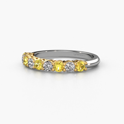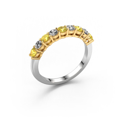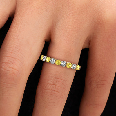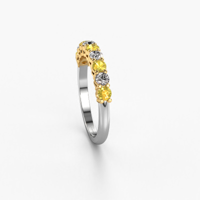Dieser 9 Stone Ring wird Michelle 9 genannt. Diese Art von Ring wird als Memoire ring bezeichnet, da seine Edelsteine in einer durchgehenden Linie angeordnet sind. Dadurch kann er einfach mit anderen Ringen kombiniert werden. Das Band dieses 14 Karat Weißgold Ring ist in einer Kombination aus Gelb Saphir und Lab-grown Diamant besetzt. Sie können ganz einfach online die Kombination auswählen, die Sie bevorzugen. Wie Sie sehen, wird bei diesem Weißgold Memoire Ring mehre Gelb Saphir gesetzt. Der Memoire ring steht für Zusammenwirken. Und genau das tun diese Edelsteine, zusammenwirken. Zusammen geben sie dem Band eines klassische Ring einen schönen Effekt! So ein bedeutungsvoller Ring, finden Sie nicht auch? Alle von uns ausgesuchten Gelb Saphir werden von unserem erfahrenen Goldschiede in Handarbeit eingefasst. Das ist eine präzise Aufgabe, die nur durch die Kombination von purer Handwerkskunst und dem Einsatz neuester Techniken erfolgreich durchgeführt werden kann, um eine optimale Wirkung zu erzielen. Um eine perfekte Lichtreflexion zu erzeugen, müssen alle Edelsteine auf die gleiche Weise perfekt ausgerichtet sein. Während der Fertigung wird der Goldschmied Meister daher ständig die Lichtreflexion überwachen, um zu gewährleisten, dass die Gelb Saphir perfekt ausgerichtet sind. Das erfordert eine geschickte Hand und viel Geduld, aber dann wird das Endprodukt zu einem echten Kunstwerk. Und genau das ist unsere Mission!Da wir unsere eigenen Ringe entwerfen und liefern, können wir Ihnen einen Ring zu einem Preis anbieten, den Sie nirgendwo anders finden. Ein Ring wird auf Bestellung angefertigt, wodurch kein überschüssiges Material anfällt. So können wir Ihnen ein gutes Angebot zum besten Preis machen. Wir verstehen, dass es sich riskant anfühlt, Ihren Ring online zu kaufen. Jedoch helfen wir Ihnen gerne beim Designprozess unter Berücksichtigung Ihres Budgets.Unser Team von talentierten, leidenschaftlichen Designern fügt unserer Online-Kollektion täglich neue Ringe-Designs hinzu. Unser Ziel dabei ist es, Ihnen eine große Vielfalt an Schmuckstücken anbieten zu können. Bitte zögern Sie nicht, ein Angebot anzufordern, wenn Sie spezielle Wünsche für Ihren Ring haben. Wir garantieren Ihnen ein Angebot, das Sie nicht ablehnen können.Um es einfacher zu machen, bieten wir eine kostenlose 30-tägige Rücksendung.