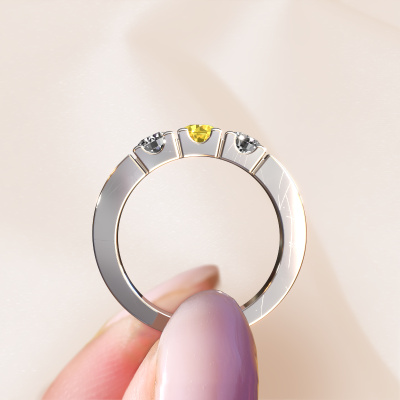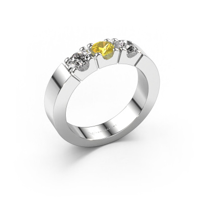 Dieser 3 Stone Ring wird Dana 3 genannt. Diese Art von Ring wird als Memoire ring bezeichnet, da seine Edelsteine in einer durchgehenden Linie angeordnet sind. Dadurch kann er einfach mit anderen Ringen kombiniert werden. Das Band dieses 14 Karat Weißgold Ring ist in einer Kombination aus Gelb Saphir und Lab-grown Diamant besetzt. Sie können ganz einfach online die Kombination auswählen, die Sie bevorzugen. Wie Sie sehen, wird bei diesem Weißgold Memoire Ring mehre Gelb Saphir gesetzt. Der Memoire ring steht für Zusammenwirken. Und genau das tun diese Edelsteine, zusammenwirken. Zusammen geben sie dem Band eines moderne Ring einen schönen Effekt! So ein bedeutungsvoller Ring, finden Sie nicht auch? Alle von uns ausgesuchten Gelb Saphir werden von unserem erfahrenen Goldschiede in Handarbeit eingefasst. Das ist eine präzise Aufgabe, die nur durch die Kombination von purer Handwerkskunst und dem Einsatz neuester Techniken erfolgreich durchgeführt werden kann, um eine optimale Wirkung zu erzielen. Um eine perfekte Lichtreflexion zu erzeugen, müssen alle Edelsteine auf die gleiche Weise perfekt ausgerichtet sein. Während der Fertigung wird der Goldschmied Meister daher ständig die Lichtreflexion überwachen, um zu gewährleisten, dass die Gelb Saphir perfekt ausgerichtet sind. Das erfordert eine geschickte Hand und viel Geduld, aber dann wird das Endprodukt zu einem echten Kunstwerk. Und genau das ist unsere Mission!Nach Erhalt Ihrer Bestellung beginnen unsere Goldschmiede mit Leidenschaft den kreativen Prozess und fertigen Ihren Ring in unserem eigenen Studio. Da wir keine großen Lager haben, werden diese Kosten nicht an Sie weitergegeben. Unsere Preisgestaltung ist der Beweis dafür! Wir bieten Schmuck zum niedrigsten Preis, garantiert.Unsere talentierten, leidenschaftlichen Designer fügen unserer Online-Kollektion täglich neue Designs hinzu. Zusammen versuchen sie, eine vielfältige Kollektion feinster Schmuckstücke zu erstellen. Wenn Sie es vorziehen, einen Ring nach Ihrem eigenen Entwurf zu machen, können Sie gerne ein Angebot anfordern. Wir machen Ihnen ein großartiges Angebot, basierend auf Qualität und Preis.Um es einfacher zu machen, bieten wir eine kostenlose 30-tägige Rücksendung.