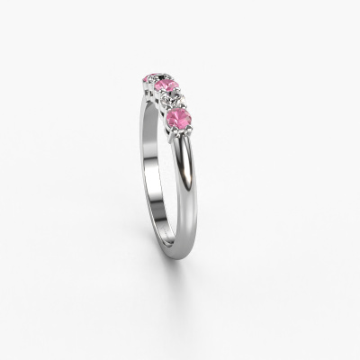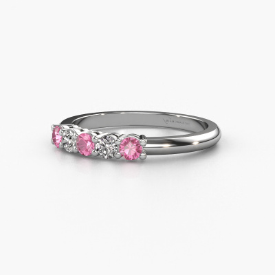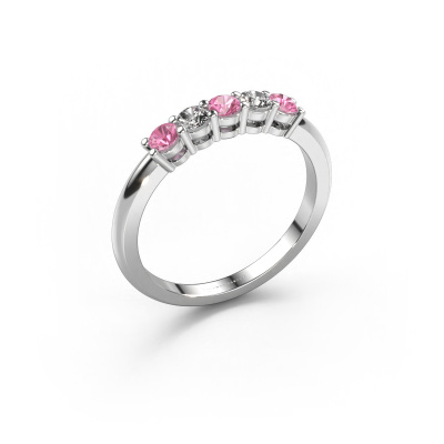 Dieser 5 Stone Ring wird Michelle 5 genannt. Diese Art von Ring wird als Memoire ring bezeichnet, da seine Edelsteine in einer durchgehenden Linie angeordnet sind. Dadurch kann er einfach mit anderen Ringen kombiniert werden. Das Band dieses 14 Karat Weißgold Ring ist in einer Kombination aus Pink Saphir und Lab-grown Diamant besetzt. Sie können ganz einfach online die Kombination auswählen, die Sie bevorzugen. Wie Sie sehen, wird bei diesem Weißgold Memoire Ring mehre Pink Saphir gesetzt. Der Memoire ring steht für Zusammenwirken. Und genau das tun diese Edelsteine, zusammenwirken. Zusammen geben sie dem Band eines klassische Ring einen schönen Effekt! So ein bedeutungsvoller Ring, finden Sie nicht auch? Alle von uns ausgesuchten Pink Saphir werden von unserem erfahrenen Goldschiede in Handarbeit eingefasst. Das ist eine präzise Aufgabe, die nur durch die Kombination von purer Handwerkskunst und dem Einsatz neuester Techniken erfolgreich durchgeführt werden kann, um eine optimale Wirkung zu erzielen. Um eine perfekte Lichtreflexion zu erzeugen, müssen alle Edelsteine auf die gleiche Weise perfekt ausgerichtet sein. Während der Fertigung wird der Goldschmied Meister daher ständig die Lichtreflexion überwachen, um zu gewährleisten, dass die Pink Saphir perfekt ausgerichtet sind. Das erfordert eine geschickte Hand und viel Geduld, aber dann wird das Endprodukt zu einem echten Kunstwerk. Und genau das ist unsere Mission!Haben Sie ein bestimmtes Budget? Sie können uns gerne kontaktieren, damit wir Ihre Optionen besprechen können. Wir bieten unsere Ringe zum garantiert besten Preis, denn wir fertigen sie auf Bestellung. Solche Preise finden Sie nirgendwo anders!