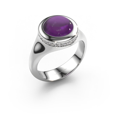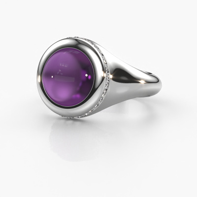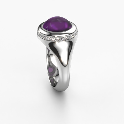 In diesem Foto ist der Weißgold Lesli RND Ring mit einem 10 mm rund cabochon Amethyst besetzt. Cabochon bedeutet, dass ein Amethyst zuerst geformt, nicht facettiert wird. Nämlich in eine bestimmte Form wie einen Tropfen, ein Herz oder ein rund cabochon. Anschließend wird er poliert, bis der Edelstein eine Runde Oberfläche hat. Ein Cabochon-Edelstein ist ein atemberaubender, nobler Blickfang, der perfekt zu einem zeitgenössischen wie auch zu einem Vintage-Stil passt. Unsere erfahrenen Goldschmiede formen den schöne Ring bis zur Perfektion und machen ihn einzigartig. Der Cabochon Amethyst ist so gefasst, dass seine einzigartigen Qualitäten verstärkt werden. Sobald Sie Ihren Lesli RND Ring mit unserem Online-Tool fertiggestellt haben, beginnen unsere Goldschmiede mit der kreativen Anfertigung Ihres Ringes. Dieser wird mit Leidenschaft und Sorgfalt nach alter Handwerkskunst gefertigt. Darüber arbeiten wir mit ehrlichen Edelsteinen. Einfach online mit unserem Online-Tool anpassen, wenn Sie Änderungen wünschen. Wenn Sie spezielle Änderungen an Ihrem Lesli RND Weißgold Ring vornehmen möchten, die in unserem Online-Tool nicht verfügbar sind, wenden Sie sich bitte an unsere Experten.Nach Erhalt Ihrer Bestellung beginnen unsere Goldschmiede mit Leidenschaft den kreativen Prozess und fertigen Ihren Ring in unserem eigenen Studio. Da wir keine großen Lager haben, werden diese Kosten nicht an Sie weitergegeben. Unsere Preisgestaltung ist der Beweis dafür! Wir bieten Schmuck zum niedrigsten Preis, garantiert.Um es einfacher zu machen, bieten wir eine kostenlose 30-tägige Rücksendung.