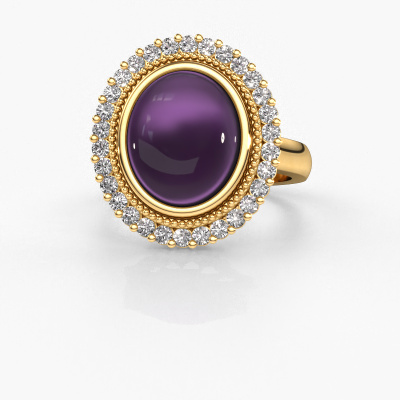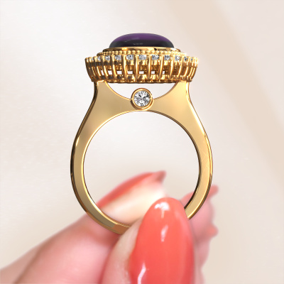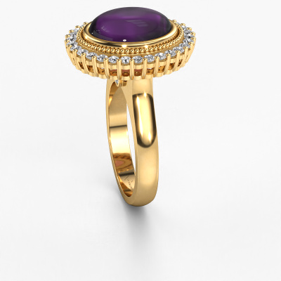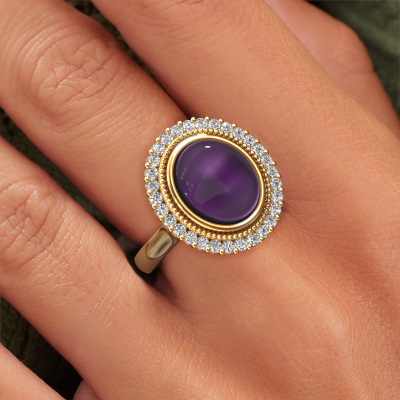 In diesem Foto ist der Gold Mila Ring mit einem 12x10 mm oval cabochon Amethyst besetzt. Cabochon bedeutet, dass ein Amethyst zuerst geformt, nicht facettiert wird. Nämlich in eine bestimmte Form wie einen Tropfen, ein Herz oder ein oval cabochon. Anschließend wird er poliert, bis der Edelstein eine Runde Oberfläche hat. Ein Cabochon-Edelstein ist ein atemberaubender, nobler Blickfang, der perfekt zu einem zeitgenössischen wie auch zu einem Vintage-Stil passt. Unsere erfahrenen Goldschmiede formen den Cluster Ring bis zur Perfektion und machen ihn einzigartig. Der Cabochon Amethyst ist so gefasst, dass seine einzigartigen Qualitäten verstärkt werden. Unsere Goldschmiede kreieren Ihren individuellen Ring leidenschaftlich, mit größter Sorgfalt und nach Ihren Wünschen. Das Gold Ring, wie hier abgebildet, kann mit unserem Online-Tool individuell angepasst werden. Bitte fragen Sie unsere Schmuckdesigner um Hilfe, wenn Sie Änderungen wünsche, die in unserem Online-Tool nicht verfügbar sind. Gerne beantworten wir Ihnen alle offenen Fragen.Durch die Kombination modernster Technik mit uralter Handwerkskunst können wir alle Ringe in unserem eigenen Studio anfertigen. Jedes Schmuckstück wird auf Anfrage gefertigt. Das ist vorteilhaft, weil wir Ihnen dadurch einen Preis anbieten können, den Sie nirgendwo anders finden.Um es einfacher zu machen, bieten wir eine kostenlose 30-tägige Rücksendung.
