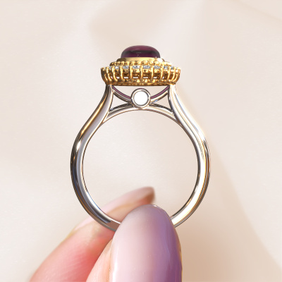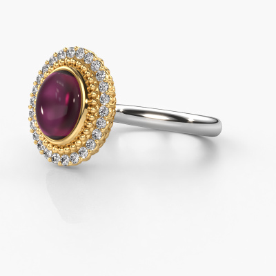 Der oben gezeigte Ring wird Maartje genannt. Ein Cluster Ring mit einem zentralen Edelstein, umgeben von kleineren Steinen. Diese Version in Weißgold hat einen 8x6 mm oval cabochon Rhodolit als Mittelstein, umschlossen von kleineren Diamanten. Wenn Sie einen Weißgold Cluster Ring sehen, werden Sie vielleicht den Eindruck bekommen, dass seine kleineren Steine mit dem größeren Rhodolit aufeinanderprallen. Deshalb ist er wie eine Blume geformt. Deshalb ist dieser Ring auch als Flowerring oder Rosettenring bekannt. Es ist sehr wichtig, dass die kleineren Diamanten identisch positioniert sind, so dass es kein Spiel im Licht, sondern eine perfekte Einheit ergibt. Unsere erfahrenen Juweliere erledigen diese Arbeit. Jeder einzelne Stein wird sorgfältig von Hand gesetzt. Während der Herstellung wird der Lichteinfall ständig überwacht. Am Ende bekommen Sie den perfekten Ring mit einem strahlenden Rhodolit Edelstein Herzstück. Sie können sich die Wirkung eines solchen Ringes vorstellen, wenn Sie ihn an ihrem besonderen Tag für die Liebe Ihres Lebens zum Leuchten bringen. Nach Erhalt Ihrer Bestellung beginnen unsere Goldschmiede mit Leidenschaft den kreativen Prozess und fertigen Ihren Ring in unserem eigenen Studio. Da wir keine großen Lager haben, werden diese Kosten nicht an Sie weitergegeben. Unsere Preisgestaltung ist der Beweis dafür! Wir bieten Schmuck zum niedrigsten Preis, garantiert.Unser Team von talentierten, leidenschaftlichen Designern fügt unserer Online-Kollektion täglich neue Ring-Designs hinzu. Unser Ziel dabei ist es, Ihnen eine große Vielfalt an Schmuckstücken anbieten zu können. Bitte zögern Sie nicht, ein Angebot anzufordern, wenn Sie spezielle Wünsche für Ihren Ring haben. Wir garantieren Ihnen ein Angebot, das Sie nicht ablehnen können.Um es einfacher zu machen, bieten wir eine kostenlose 30-tägige Rücksendung.