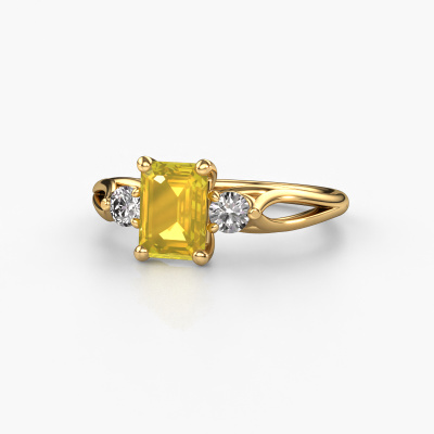 Dieser Ring aus 14 Karat Gold heißt Amie EME und hat 7x5 mm Gelb Saphir. Dieser geschmackvolle 14 Karat Gold 3-stone Verlobungsring ist ein wahres Kunstwerk! Die Ornamente werden mit viel Geduld und großer Leidenschaft gefertigt. Um diesen Ring mit großer Präzision zu schaffen, erfordert dieses Handwerk ein scharfes Auge und eine geschickte Hand. Eine Herausforderung, die bei unseren erfahrenen Juwelieren ein Feuer entfacht. Die exquisiten Gelb Saphir sind auf eine besondere Art und Weise gefasst, so dass sie noch mehr hervorstechen. Dies verleiht dem Ring eine noch glamourösere Erscheinung. Der Ring an sich ist schon wegen der Edelsteine einzigartig, die wir speziell für diesen Ring auswählen. Obendrein wählen Sie die Edelmetalle aus, mit denen Ihr einzigartiger Ring für die außergewöhnlichste Frau Ihres Lebens gemacht wird! Jedes Schmuckstück lässt Ihren Finger erstrahlen. Ihr Ring ist mit Liebe von unseren Goldschmieden handgefertigt.Haben Sie ein bestimmtes Budget? Sie können uns gerne kontaktieren, damit wir Ihre Optionen besprechen können. Wir bieten unsere Verlobungsringe zum garantiert besten Preis, denn wir fertigen sie auf Bestellung. Solche Preise finden Sie nirgendwo anders!Unser Team fügt unserer Online-Kollektion täglich neue Designs hinzu. Unsere Designer und Goldschmiede arbeiten zusammen, um das beste Design zu kreieren. Wir bemühen uns, eine vielfältige Kollektion von Schmuckstücken anzubieten. Vielleicht haben Sie ein bestimmtes Design im Sinn. Eines, dass Sie irgendwo gesehen haben. Gerne geben wir Ihnen eine kostenlose Beratung. Wir machen Ihnen ein Angebot, basierend auf einem fairen Preis/Leistungsverhältnis, das Sie verblüffen wird.Um es einfacher zu machen, bieten wir eine kostenlose 30-tägige Rücksendung.