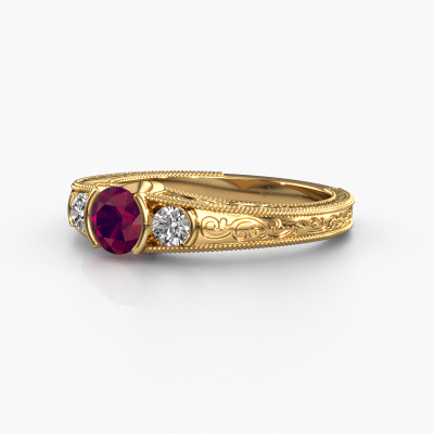 Dieser Filigrane Verlobungsring aus 14 Karat Gold heißt Tasia und hat 5 mm Rhodolit. Ist Ihre Freundin von Vintage begeistert? Dann wird dieser Gold Verlobungsring sicherlich perfekt zu ihrem Stil passen. Ein trendiger Ring mit einem Hauch von klassischem Schmuck. Ein wirklich atemberaubendes, romantisches Design! Vor allem, wenn Sie den Ring nach ihren Wünschen anpassen. Dieser Vintage 3-stone Verlobungsring ist mit atemberaubenden Rhodolit besetzt. Wie Sie sehen können, sind Sie der Boss bei der Auswahl des Edelsteins, der am besten zu Ihrer Freundin passt. Jeder Edelstein wird sorgfältig von unseren Händlern ausgewählt, die auf der ganzen Welt verteilt sind. Nichts als die besten Edelsteine für unseren erfahrenen Juwelier! Schließlich ist es seine Krönung! Jedes Schmuckstück wird hergestellt mit Leidenschaft und Liebe, von einem unserer Meister-Goldschmiede.Durch die Kombination modernster Technik mit uralter Handwerkskunst können wir alle Verlobungsringe in unserem eigenen Studio anfertigen. Jedes Schmuckstück wird auf Anfrage gefertigt. Das ist vorteilhaft, weil wir Ihnen dadurch einen Preis anbieten können, den Sie nirgendwo anders finden.Unser Team fügt unserer Online-Kollektion täglich neue Designs hinzu. Unsere Designer und Goldschmiede arbeiten zusammen, um das beste Design zu kreieren. Wir bemühen uns, eine vielfältige Kollektion von Schmuckstücken anzubieten. Vielleicht haben Sie ein bestimmtes Design im Sinn. Eines, dass Sie irgendwo gesehen haben. Gerne geben wir Ihnen eine kostenlose Beratung. Wir machen Ihnen ein Angebot, basierend auf einem fairen Preis/Leistungsverhältnis, das Sie verblüffen wird.Um es einfacher zu machen, bieten wir eine kostenlose 30-tägige Rücksendung.