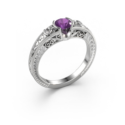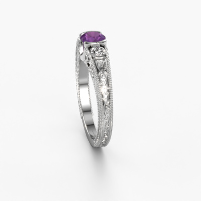 Dieser Filigrane Verlobungsring aus 14 Karat Weißgold heißt Tasia und hat 5 mm Amethyst. Ist Ihre Freundin von Vintage begeistert? Dann wird dieser Weißgold Verlobungsring sicherlich perfekt zu ihrem Stil passen. Ein trendiger Ring mit einem Hauch von klassischem Schmuck. Ein wirklich atemberaubendes, romantisches Design! Vor allem, wenn Sie den Ring nach ihren Wünschen anpassen. Dieser Vintage 3-stone Verlobungsring ist mit atemberaubenden Amethysten besetzt. Wie Sie sehen können, sind Sie der Boss bei der Auswahl des Edelsteins, der am besten zu Ihrer Freundin passt. Jeder Edelstein wird sorgfältig von unseren Händlern ausgewählt, die auf der ganzen Welt verteilt sind. Nichts als die besten Edelsteine für unseren erfahrenen Juwelier! Schließlich ist es seine Krönung! Jedes Schmuckstück wird hergestellt mit Leidenschaft und Liebe, von einem unserer Meister-Goldschmiede.Durch die Kombination modernster Technik mit uralter Handwerkskunst können wir alle Verlobungsringe in unserem eigenen Studio anfertigen. Jedes Schmuckstück wird auf Anfrage gefertigt. Das ist vorteilhaft, weil wir Ihnen dadurch einen Preis anbieten können, den Sie nirgendwo anders finden.Unser Team fügt unserer Online-Kollektion täglich neue Designs hinzu. Unsere Designer und Goldschmiede arbeiten zusammen, um das beste Design zu kreieren. Wir bemühen uns, eine vielfältige Kollektion von Schmuckstücken anzubieten. Vielleicht haben Sie ein bestimmtes Design im Sinn. Eines, dass Sie irgendwo gesehen haben. Gerne geben wir Ihnen eine kostenlose Beratung. Wir machen Ihnen ein Angebot, basierend auf einem fairen Preis/Leistungsverhältnis, das Sie verblüffen wird.Um es einfacher zu machen, bieten wir eine kostenlose 30-tägige Rücksendung.
