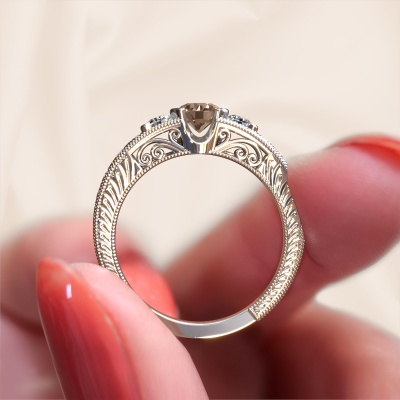 Dieser Filigrane Verlobungsring aus 14 Karat Weißgold heißt Tasia und hat 0.70 crt Braun Diamant. Ist Ihre Freundin von Vintage begeistert? Dann wird dieser Weißgold Verlobungsring sicherlich perfekt zu ihrem Stil passen. Ein trendiger Ring mit einem Hauch von klassischem Schmuck. Ein wirklich atemberaubendes, romantisches Design! Vor allem, wenn Sie den Ring nach ihren Wünschen anpassen. Dieser Vintage 3-stone Verlobungsring ist mit atemberaubenden Braune Diamanten besetzt. Wie Sie sehen können, sind Sie der Boss bei der Auswahl des Edelsteins, der am besten zu Ihrer Freundin passt. Jeder Edelstein wird sorgfältig von unseren Händlern ausgewählt, die auf der ganzen Welt verteilt sind. Nichts als die besten Edelsteine für unseren erfahrenen Juwelier! Schließlich ist es seine Krönung! Jedes Schmuckstück wird hergestellt mit Leidenschaft und Liebe, von einem unserer Meister-Goldschmiede.Durch die Kombination modernster Technik mit uralter Handwerkskunst können wir alle Verlobungsringe in unserem eigenen Studio anfertigen. Jedes Schmuckstück wird auf Anfrage gefertigt. Das ist vorteilhaft, weil wir Ihnen dadurch einen Preis anbieten können, den Sie nirgendwo anders finden.Unser Team fügt unserer Online-Kollektion täglich neue Designs hinzu. Unsere Designer und Goldschmiede arbeiten zusammen, um das beste Design zu kreieren. Wir bemühen uns, eine vielfältige Kollektion von Schmuckstücken anzubieten. Vielleicht haben Sie ein bestimmtes Design im Sinn. Eines, dass Sie irgendwo gesehen haben. Gerne geben wir Ihnen eine kostenlose Beratung. Wir machen Ihnen ein Angebot, basierend auf einem fairen Preis/Leistungsverhältnis, das Sie verblüffen wird.Um es einfacher zu machen, bieten wir eine kostenlose 30-tägige Rücksendung.