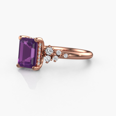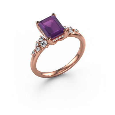 Der oben gezeigte Ring wird Emma EME genannt. Es ist ein Pavé Solitär Ring, da er einen zentralen Edelstein und ein Band mit Pavé-Fassung hat. Dieser 585 Roségold ring ist mit einem 8x6 mm smaragd schliff Amethyst-Mittelstein besetzt und das Band hat eine Pavé-Fassung mit Lab grown Diamant. Jedes Schmuckstück wird hergestellt mit Leidenschaft und Liebe, von einem unserer Meister-Goldschmiede.Dieser Fantasie Roségold Pavé Solitär Verlobungsring mit Pavé-Fassung hat einen exquisiten, smaragd schliff Amethyst als Mittelstein. Um den zentralen Stein noch mehr zu betonen, hat das Band eine Pavé-Fassung mit weiteren Lab grown Diamant. Durch die offenen Krappen kann das Licht aus mehreren Winkeln auf den Amethyst treffen und der Amethyst-Ring funkelt noch mehr. Das obere Foto zeigt die leidenschaftlich handgefertigten Details des Rings. Die hohe Positionierung der Mittelstein ist ein echter Blickfang. Der perfekte Verlobungsring für das Kronjuwel Ihres Lebens!Nach Erhalt Ihrer Bestellung beginnen unsere Goldschmiede mit Leidenschaft den kreativen Prozess und fertigen Ihren Verlobungsring in unserem eigenen Studio. Da wir keine großen Lager haben, werden diese Kosten nicht an Sie weitergegeben. Unsere Preisgestaltung ist der Beweis dafür! Wir bieten Schmuck zum niedrigsten Preis, garantiert.Unser Team fügt unserer Online-Kollektion täglich neue Designs hinzu. Unsere Designer und Goldschmiede arbeiten zusammen, um das beste Design zu kreieren. Wir bemühen uns, eine vielfältige Kollektion von Schmuckstücken anzubieten. Vielleicht haben Sie ein bestimmtes Design im Sinn. Eines, dass Sie irgendwo gesehen haben. Gerne geben wir Ihnen eine kostenlose Beratung. Wir machen Ihnen ein Angebot, basierend auf einem fairen Preis/Leistungsverhältnis, das Sie verblüffen wird.Um es einfacher zu machen, bieten wir eine kostenlose 30-tägige Rücksendung.